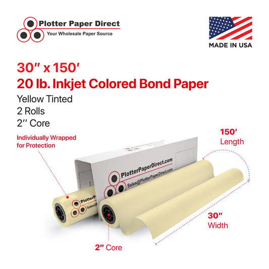 30'' x 150' Rolls - 20 lb Yellow Tinted/Colored Bond Plotter Paper on 2'' Core (Pack of 2)