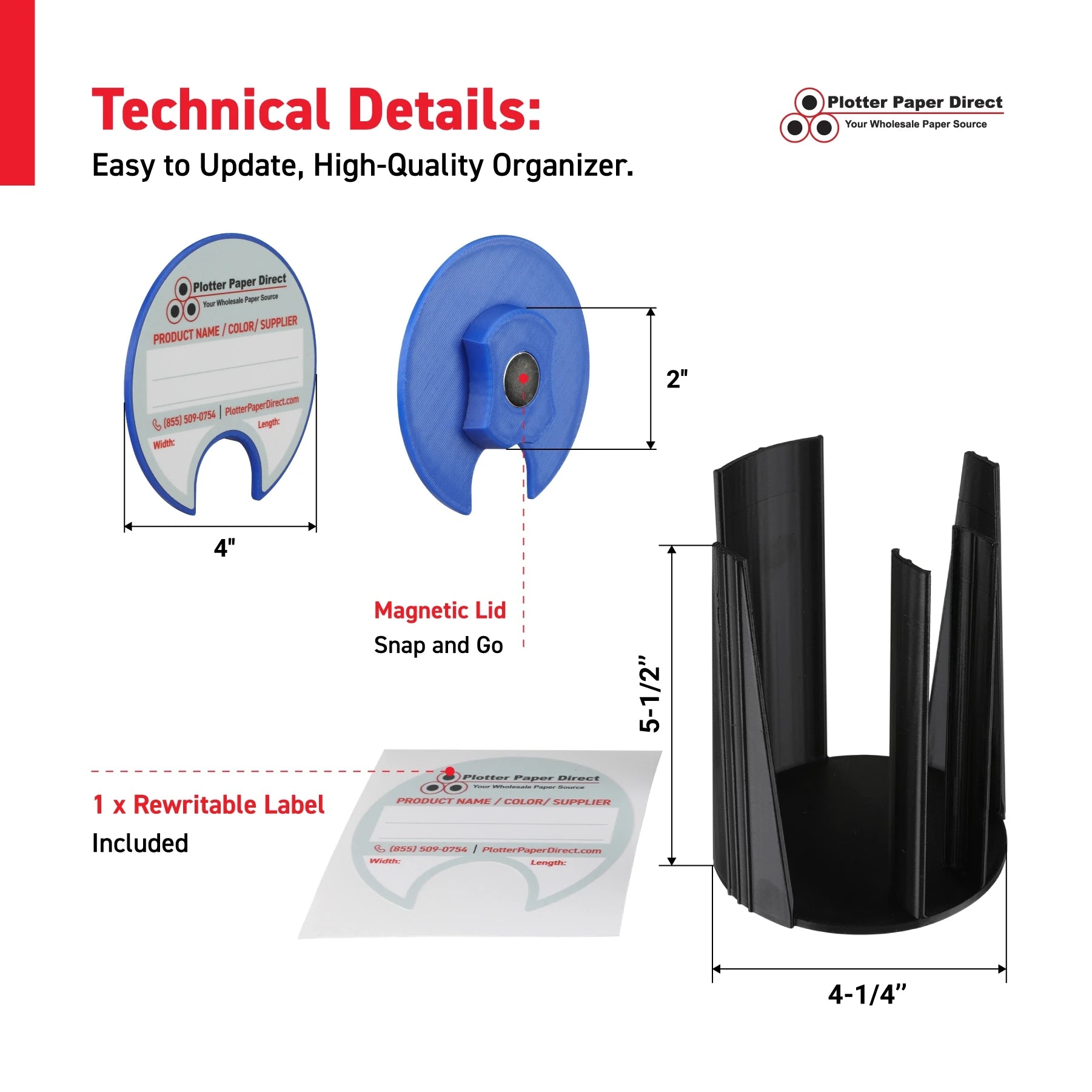 Kit of 10 Rewritable Blue Lids for 2" Core Media Rolls + 1 Black Bench Organizer for 2" & 3" Cores – Durable Storage & Organization for Print Shops and Studios