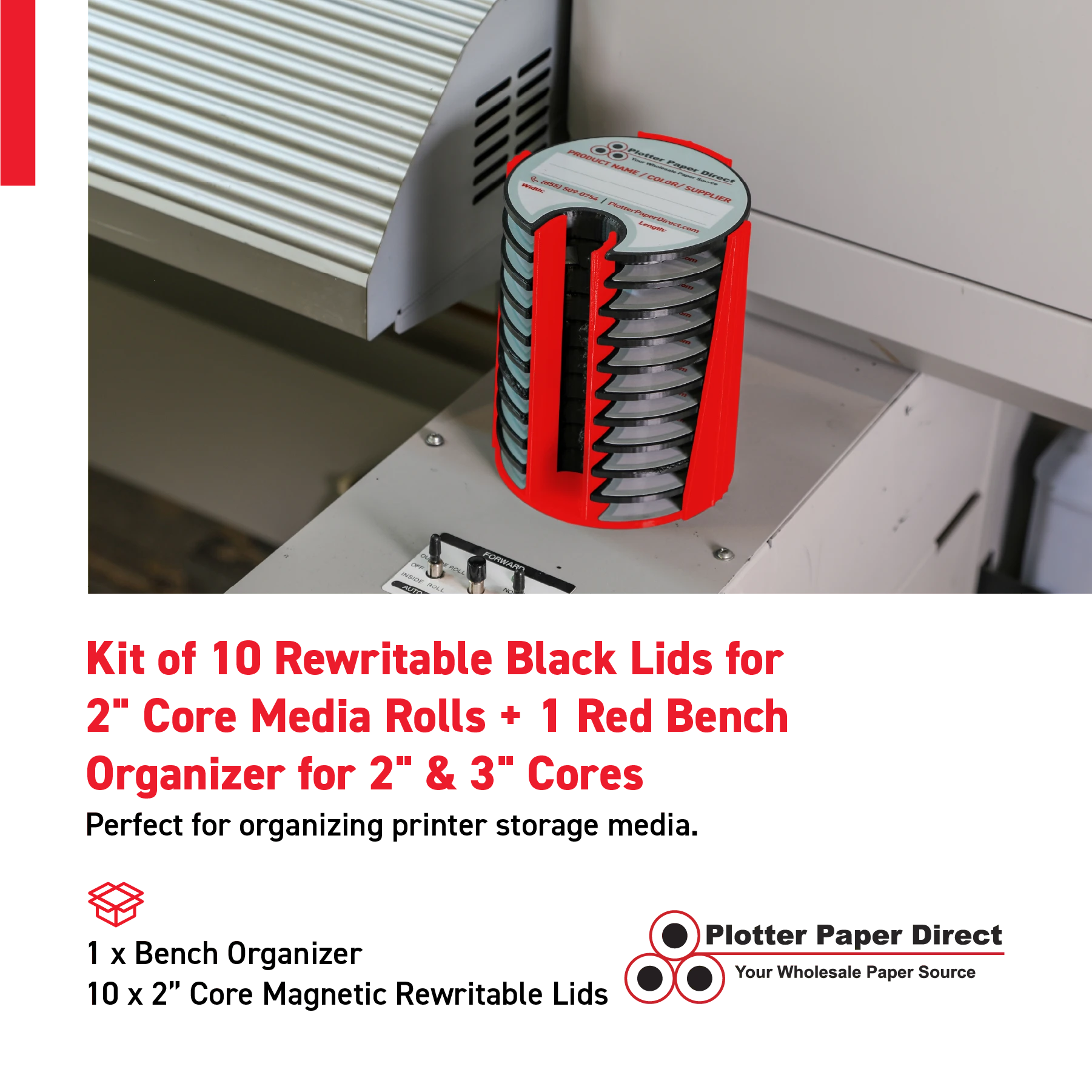 Kit of 10 Rewritable Black Lids for 2" Core Media Rolls + 1 Red Bench Organizer for 2" & 3" Cores – Durable Storage & Organization for Print Shops and Studios