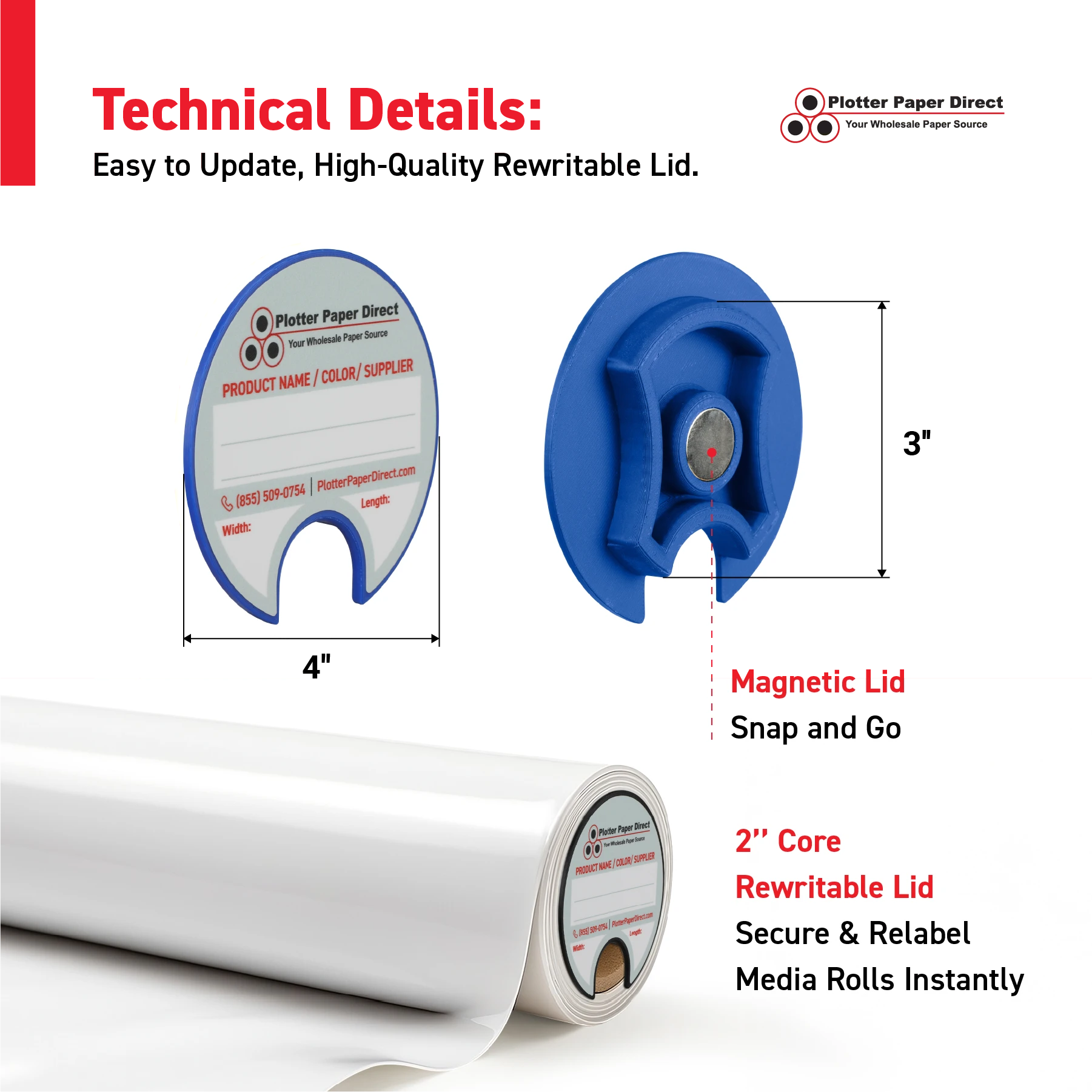 Secure and label your media rolls with this rewritable Blue lid for 3" cores. Durable, reusable, and perfect for organizing print or storage media.