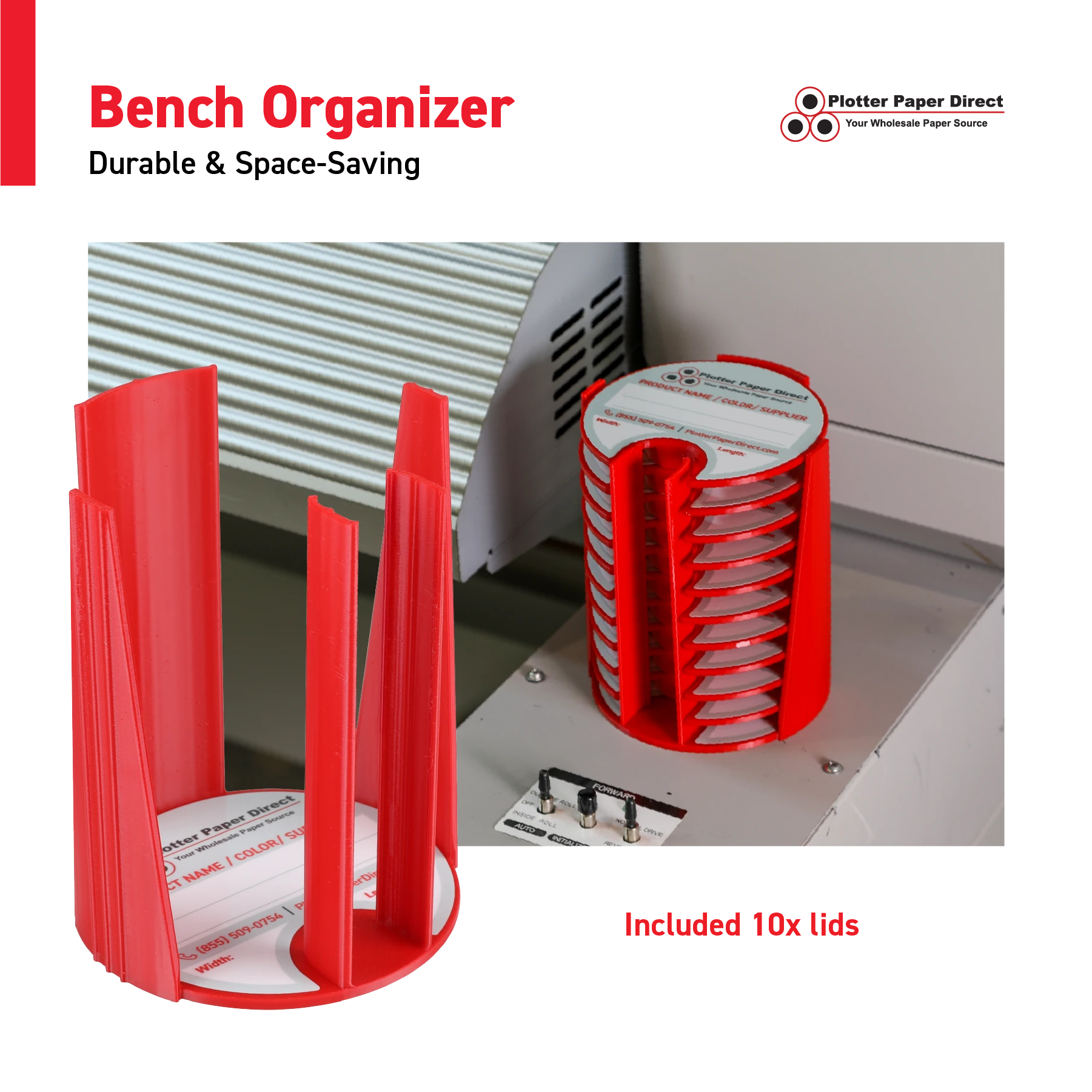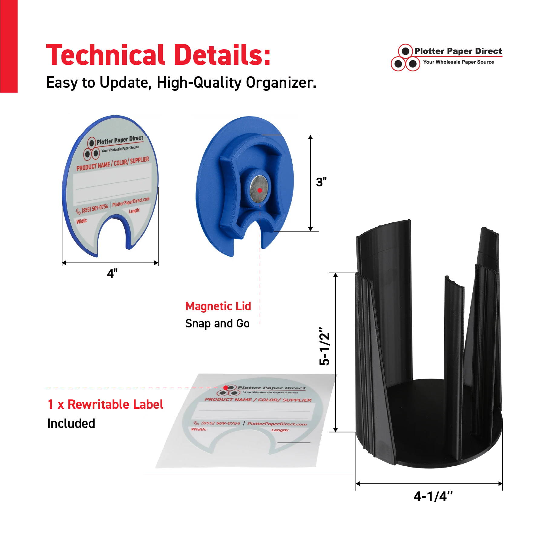Kit of 10 Rewritable Blue Lids for 3" Core Media Rolls + 1 Black Bench Organizer for 2" & 3" Cores – Durable Storage & Organization for Print Shops and Studios