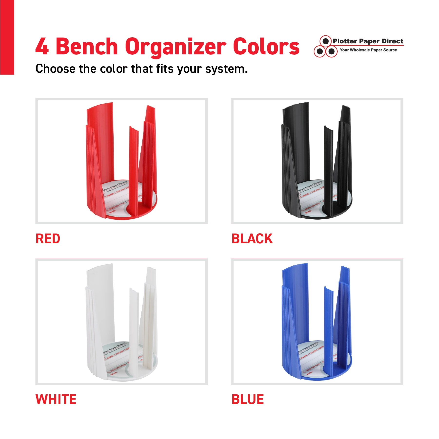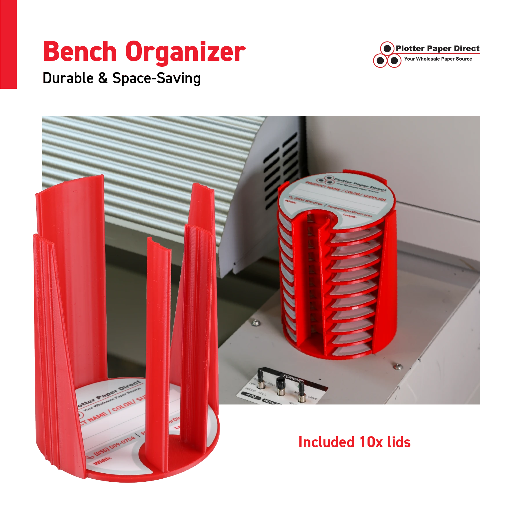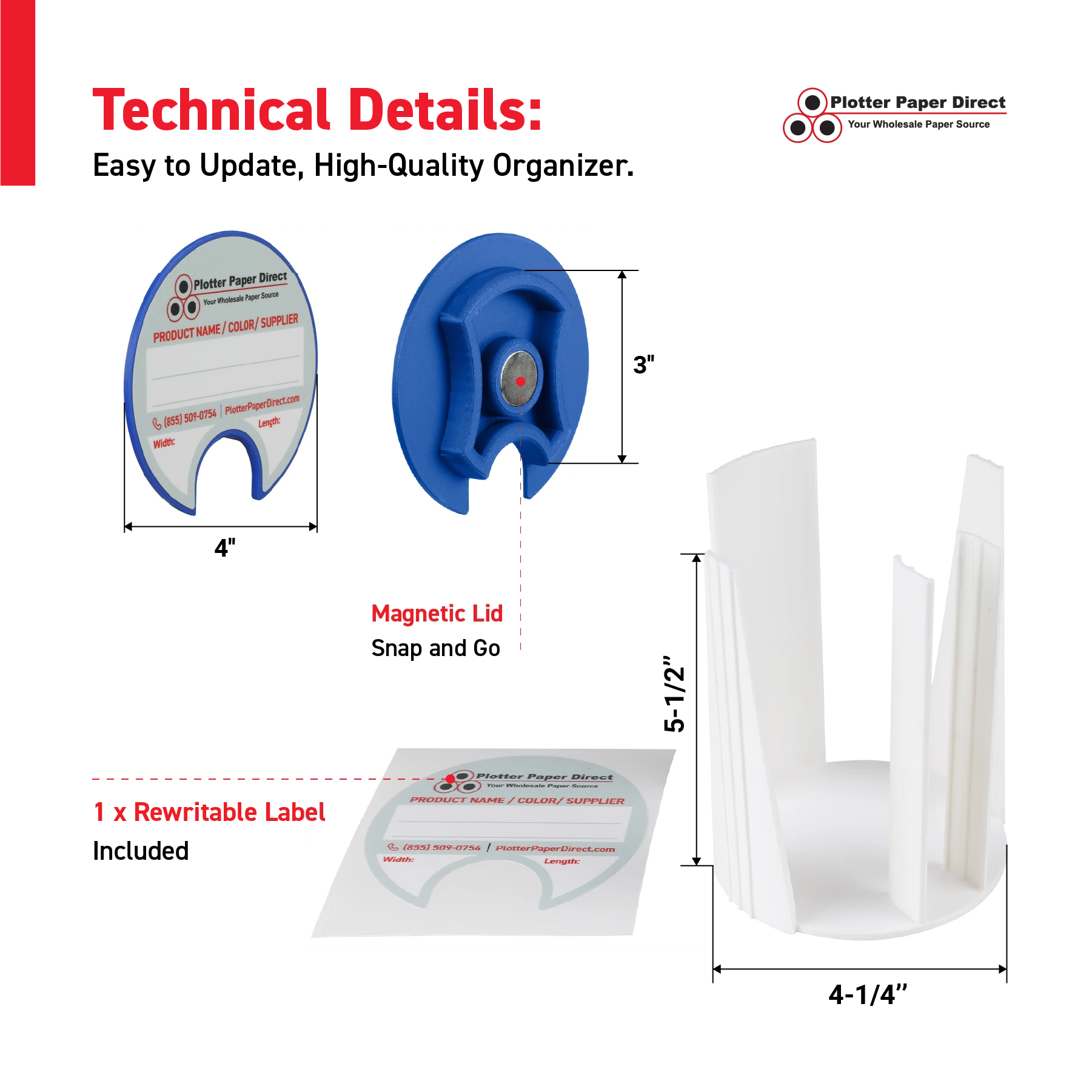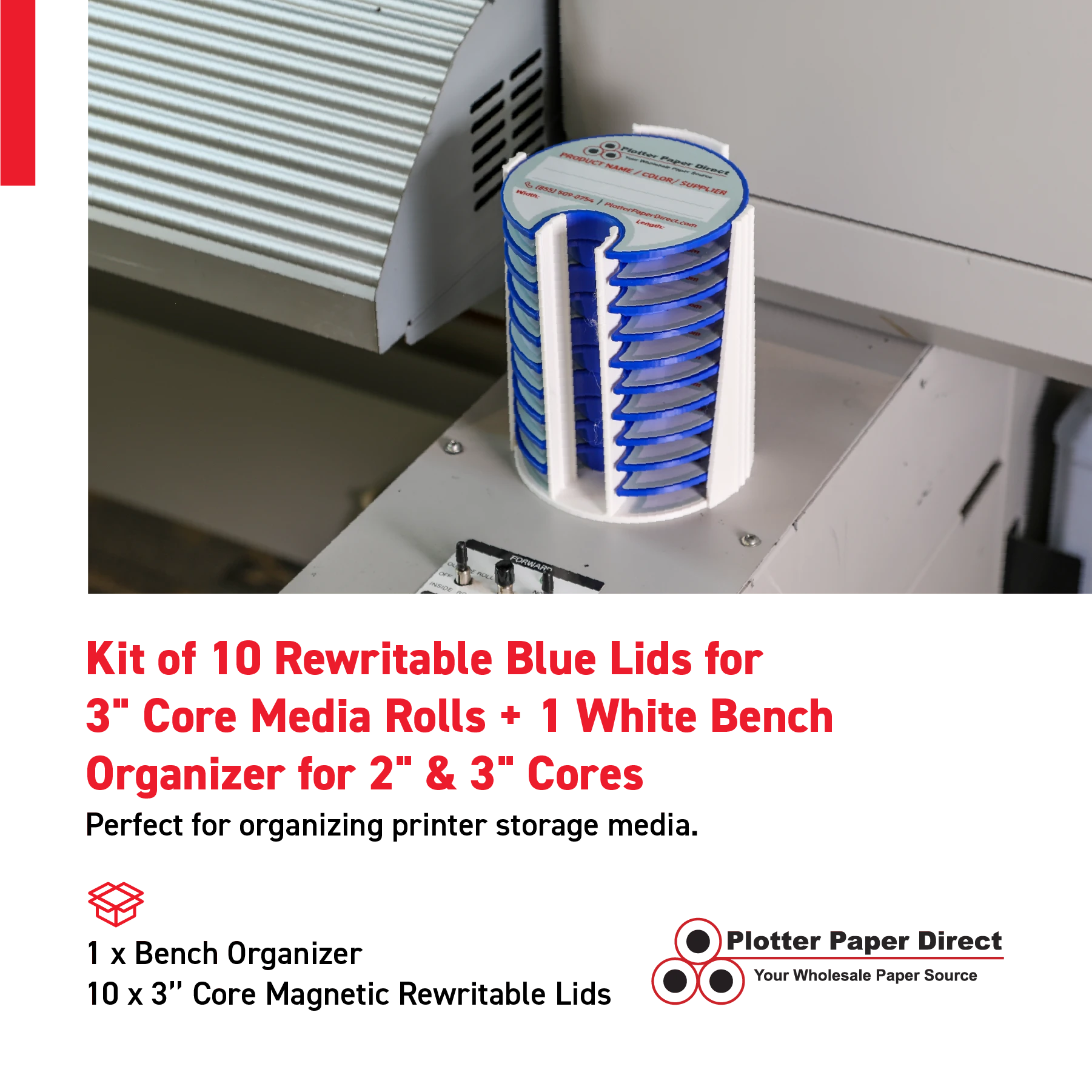 Kit of 10 Rewritable Blue Lids for 3" Core Media Rolls + 1 White Bench Organizer for 2" & 3" Cores – Durable Storage & Organization for Print Shops and Studios