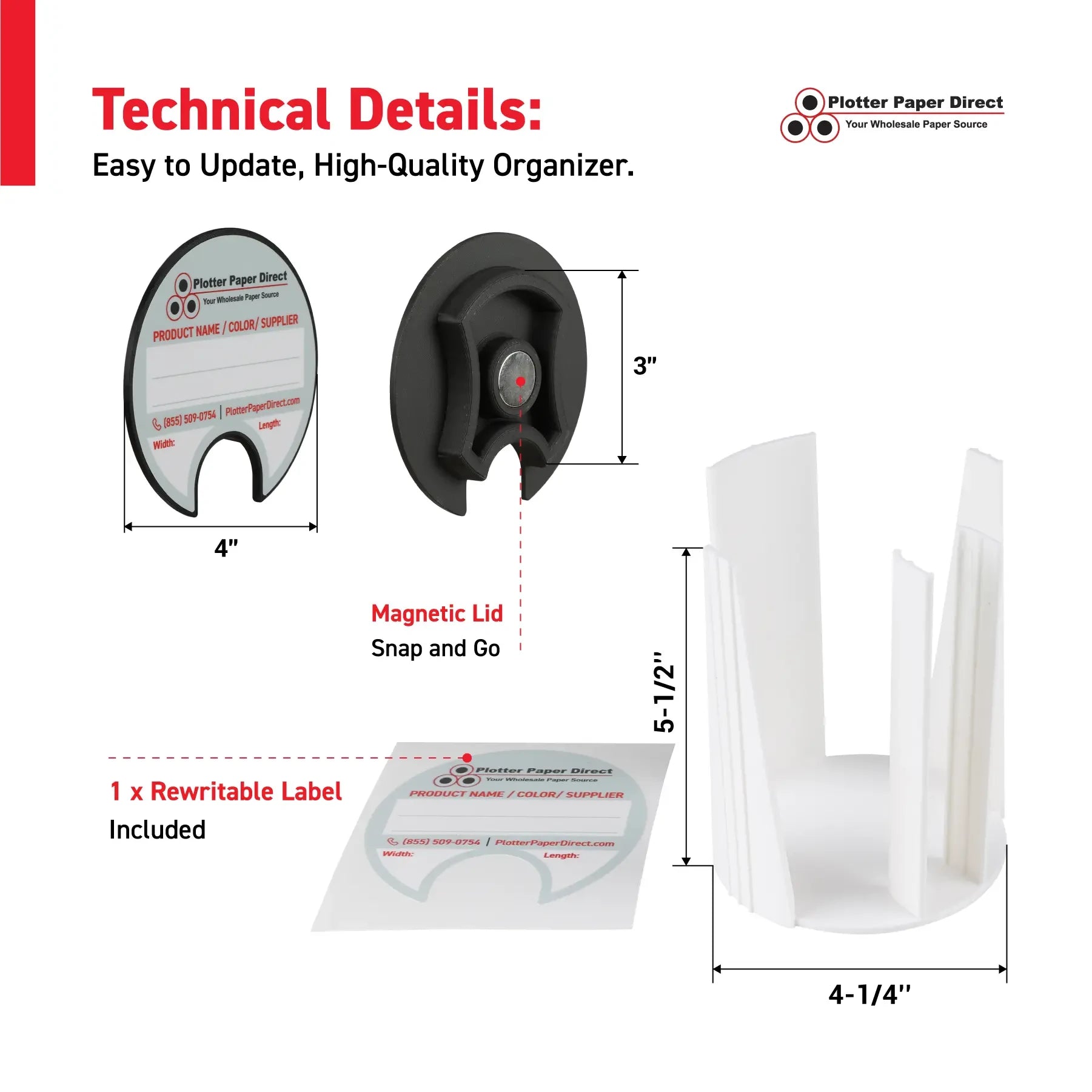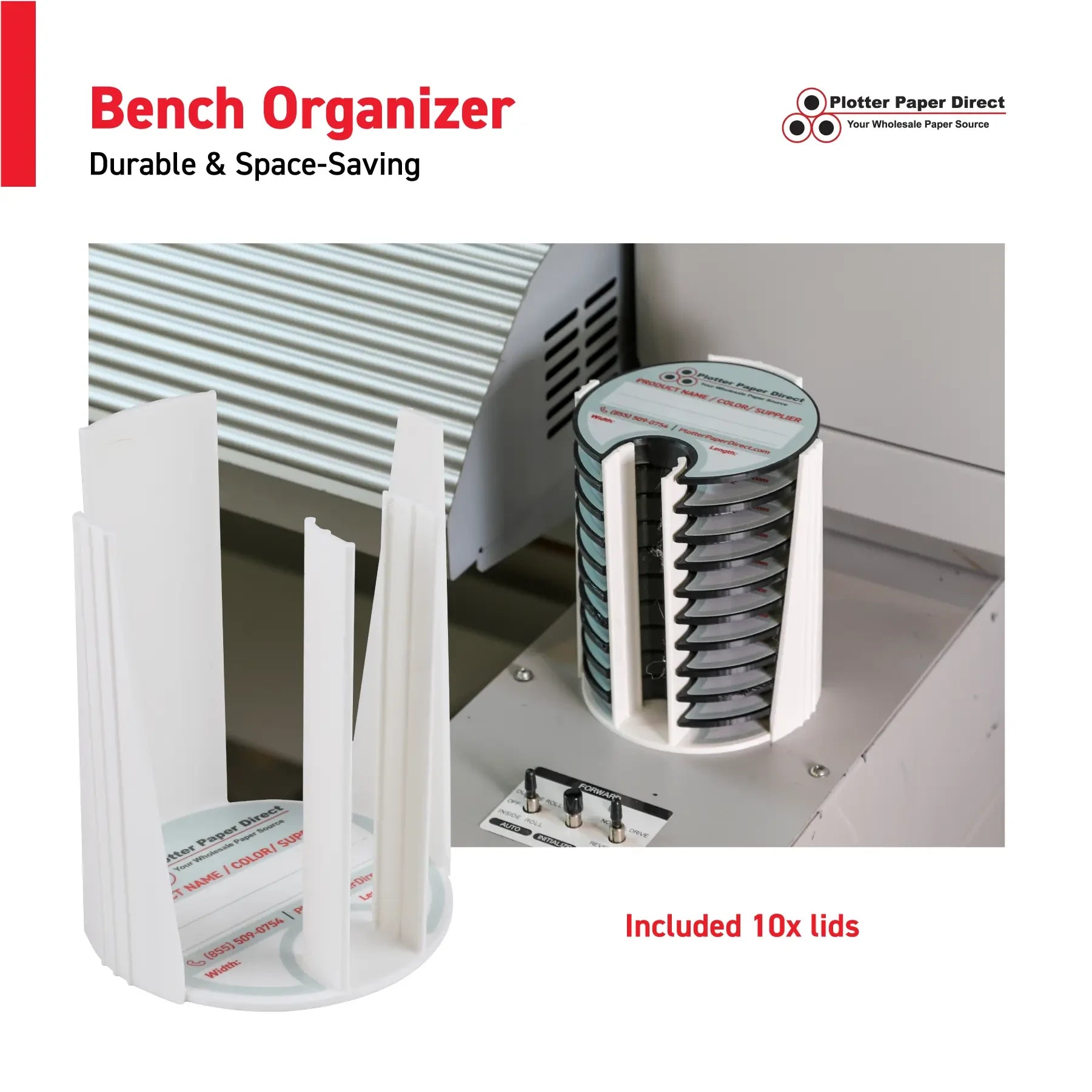 Kit of 10 Rewritable Black Lids for 3" Core Media Rolls + 1 White Bench Organizer for 2" & 3" Cores – Durable Storage & Organization for Print Shops and Studios