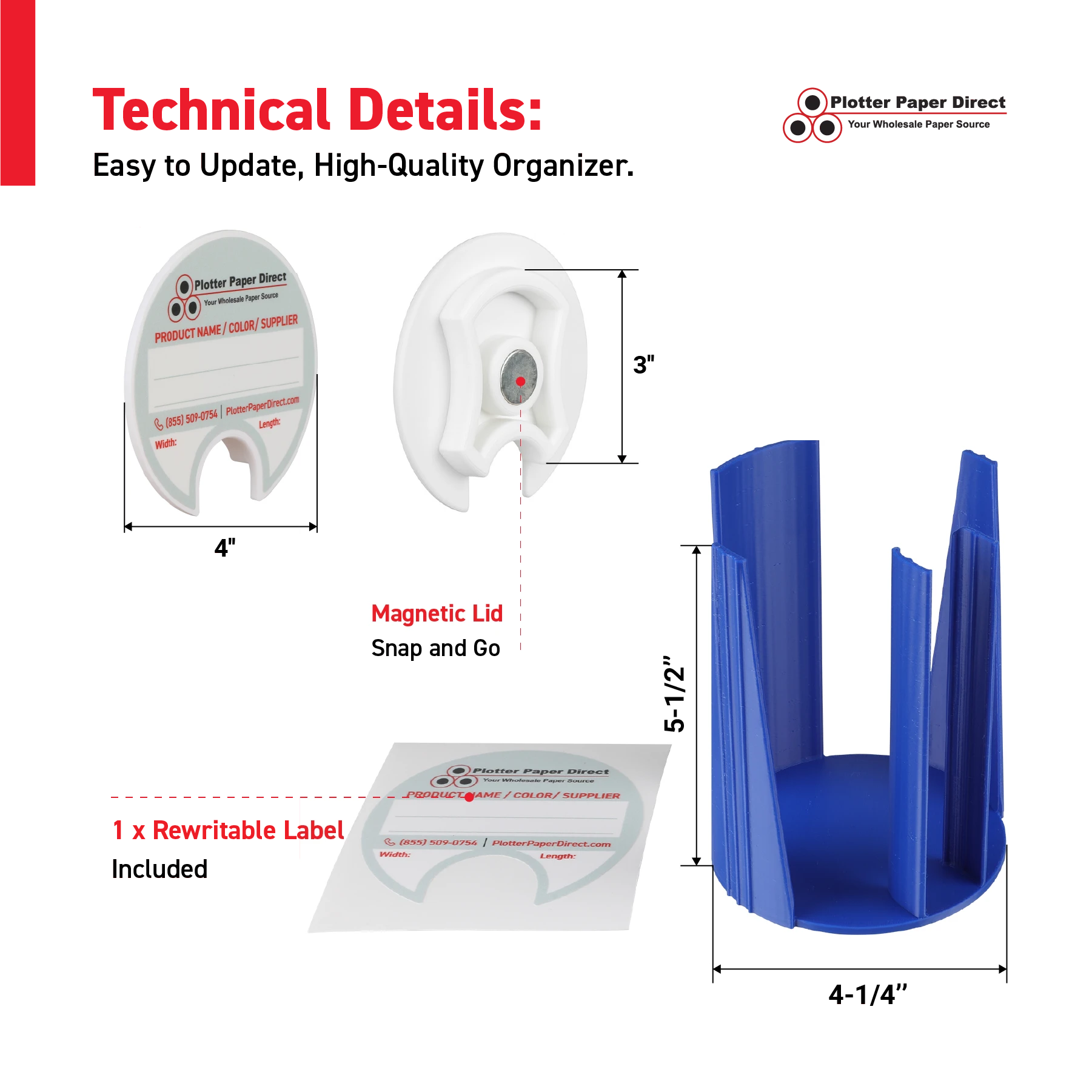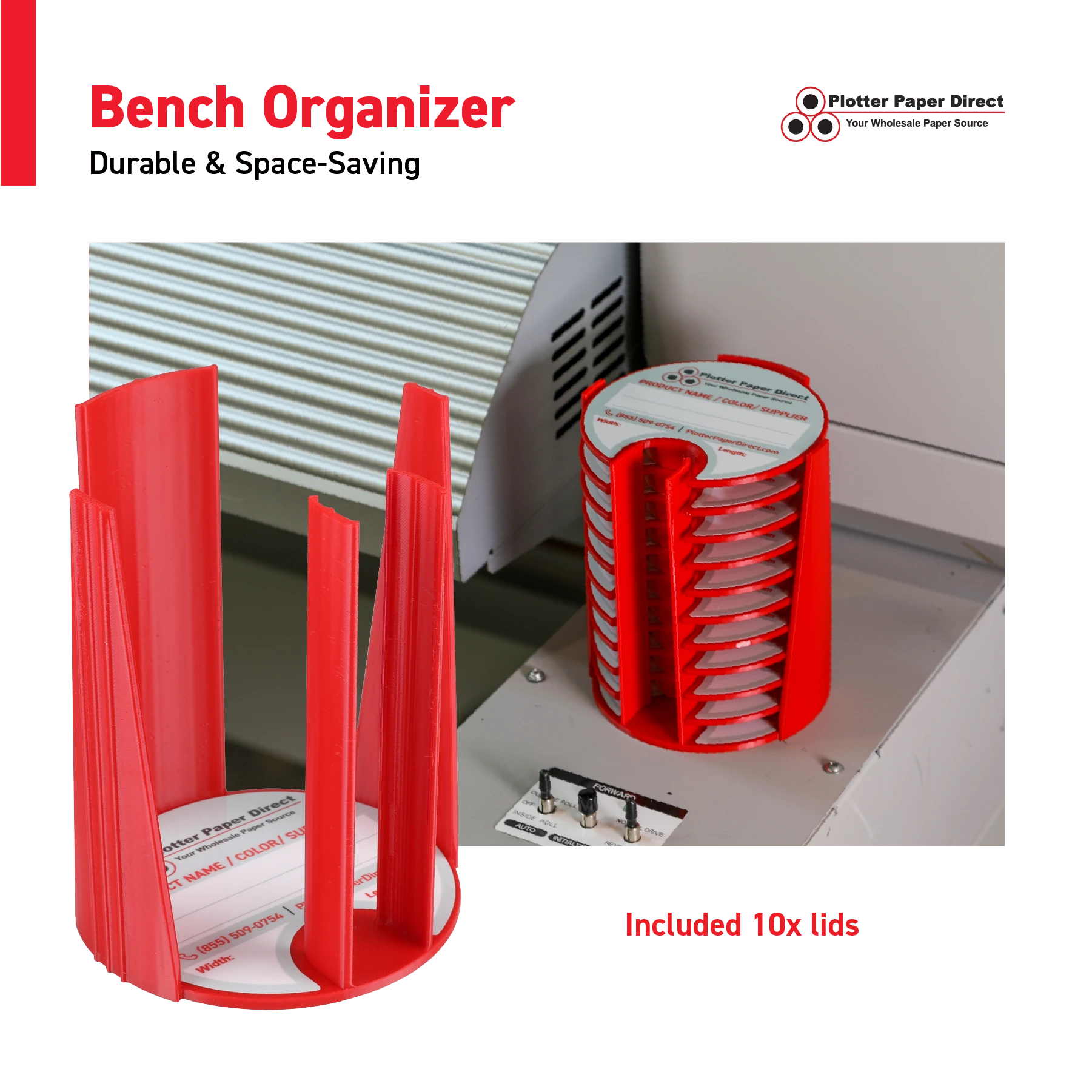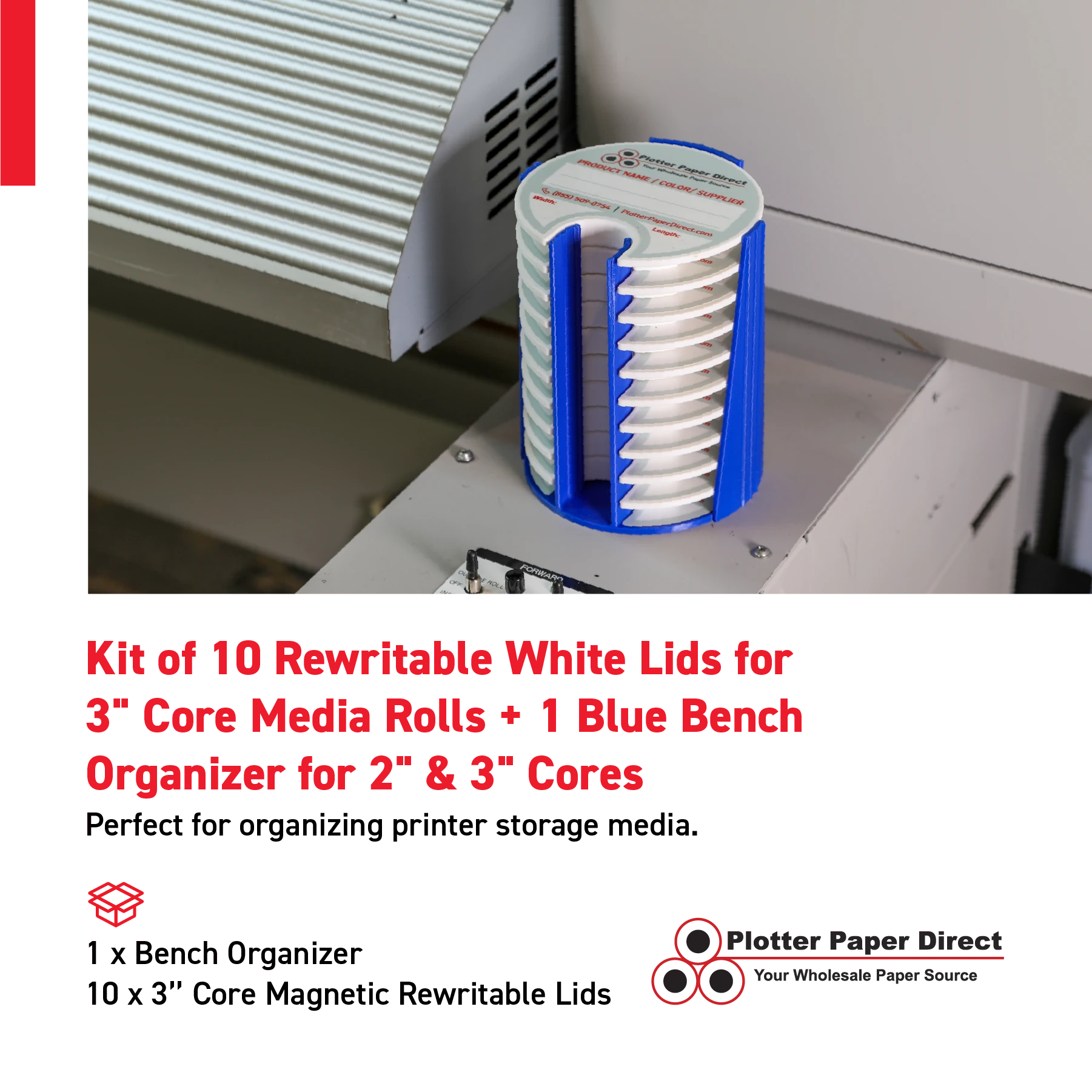 Kit of 10 Rewritable White Lids for 3" Core Media Rolls + 1 Blue Bench Organizer for 2" & 3" Cores – Durable Storage & Organization for Print Shops and Studios