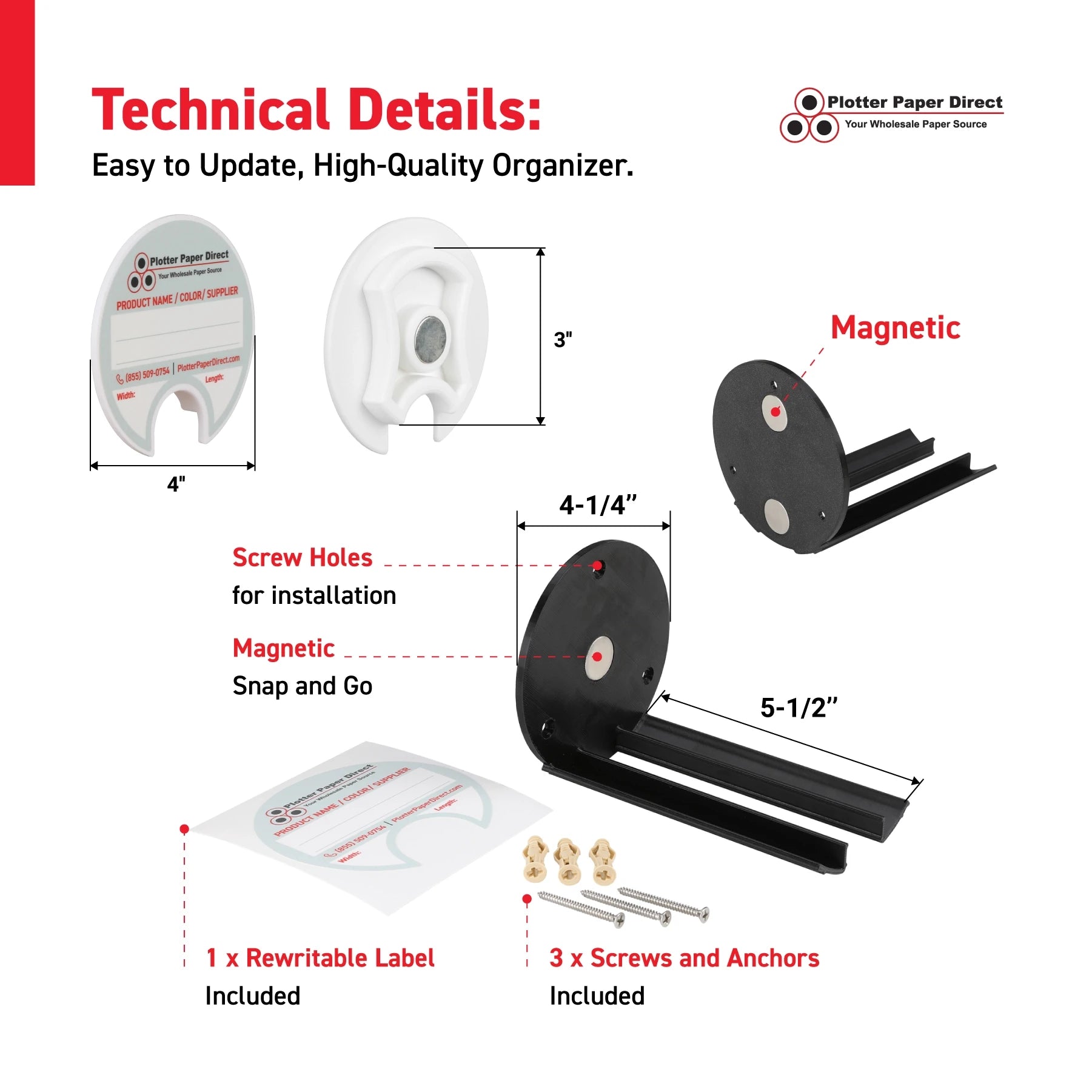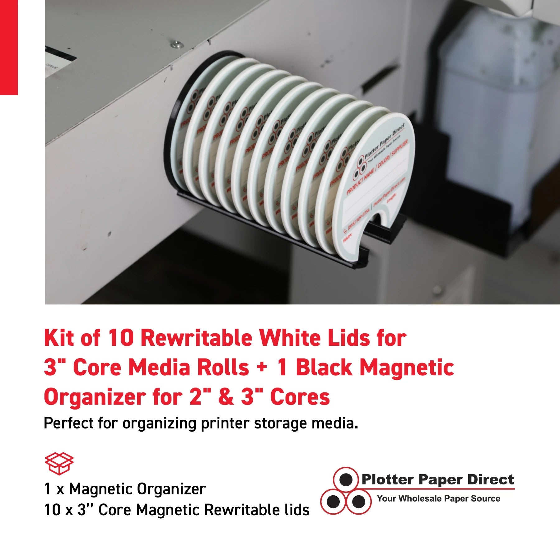 Kit of 10 Rewritable White Lids for 3" Core Media Rolls + 1 Black Magnetic Wall Organizer for 2" & 3" Cores – Durable Storage Solution for Print & Sign Shops