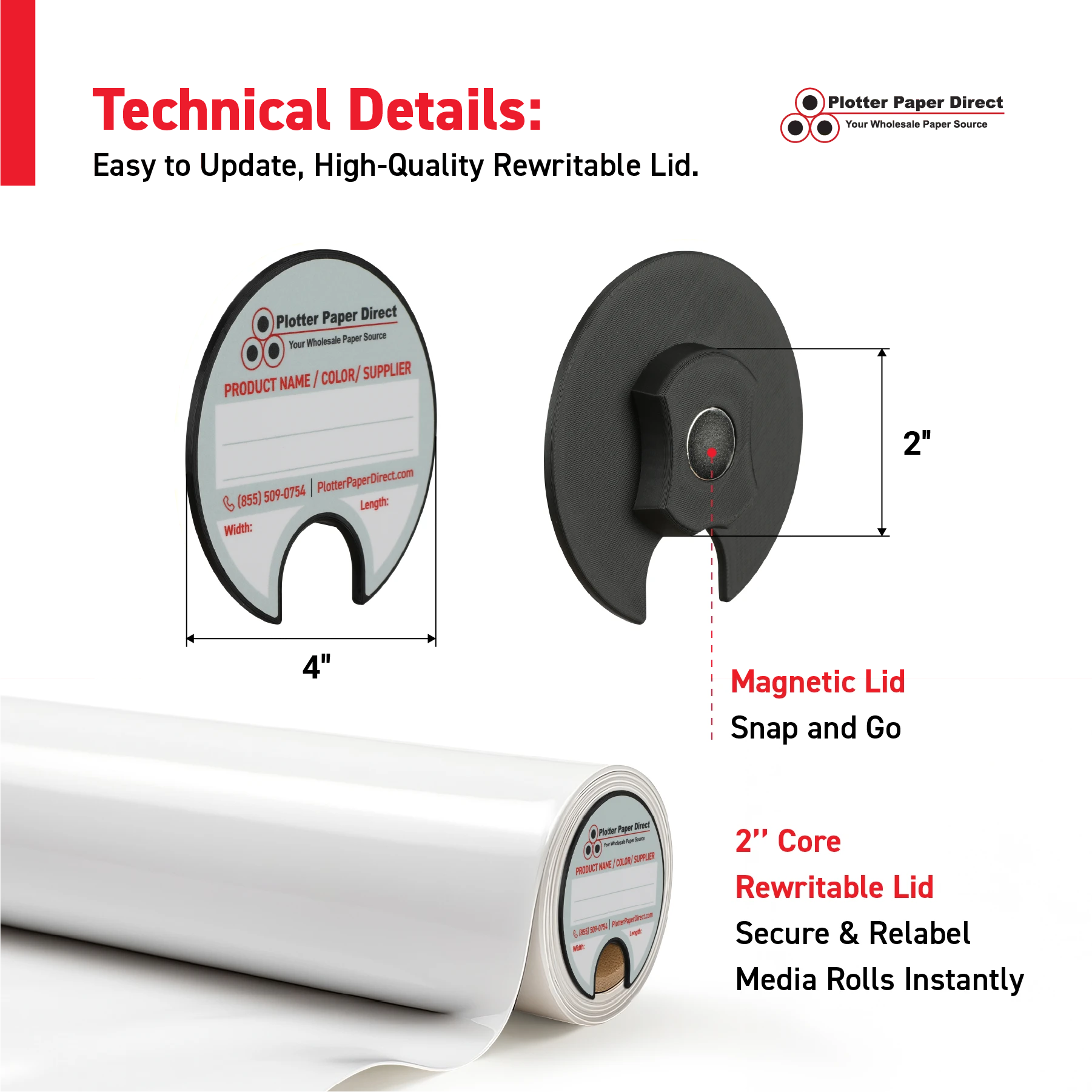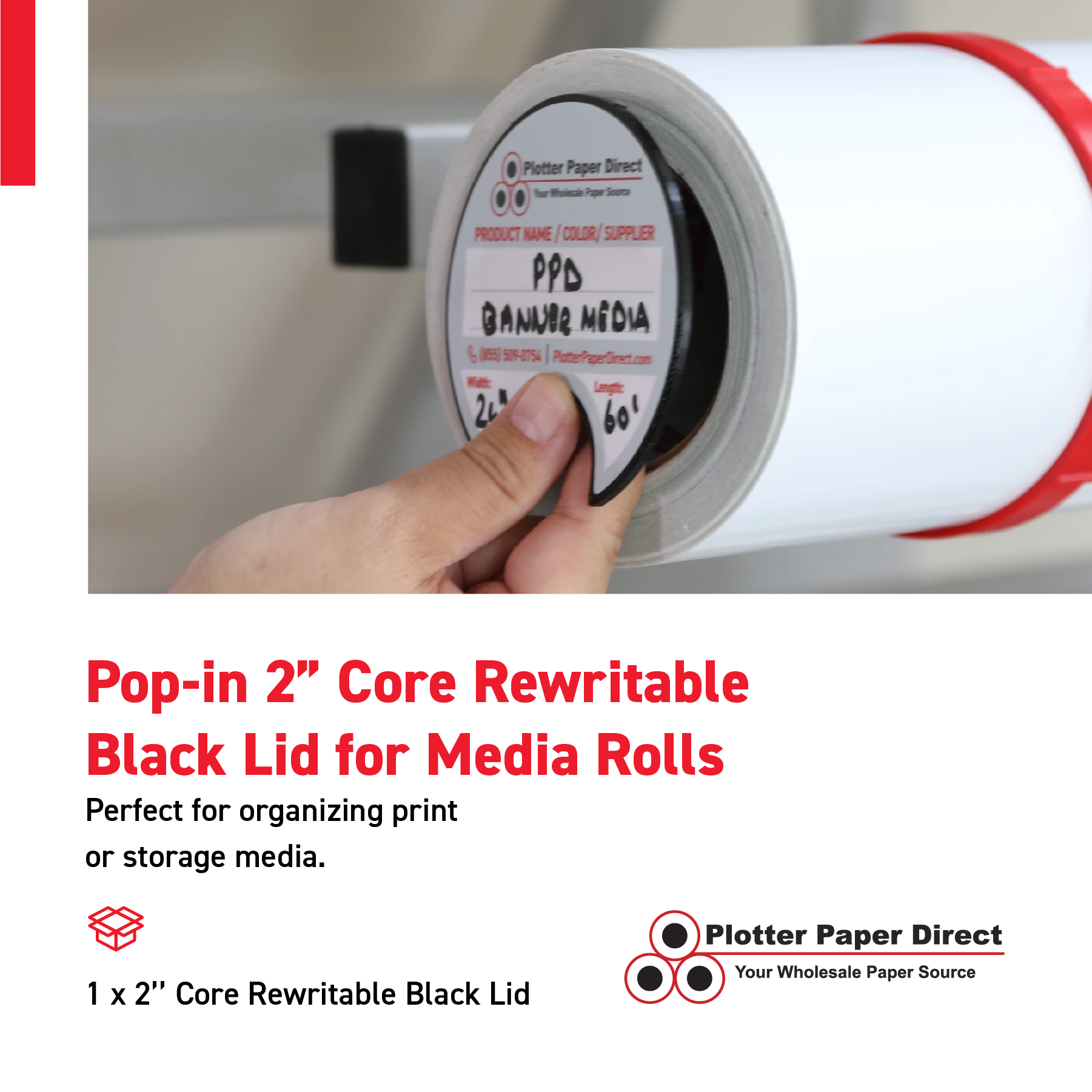 Secure and label your media rolls with this rewritable black lid for 2" cores. Durable, reusable, and perfect for organizing print or storage media.