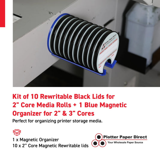 Kit of 10 Rewritable Black Lids for 2" Core Media Rolls + 1 Blue Magnetic Wall Organizer for 2" & 3" Cores – Durable Storage Solution for Print & Sign Shops