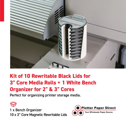 Kit of 10 Rewritable Black Lids for 3" Core Media Rolls + 1 White Bench Organizer for 2" & 3" Cores – Durable Storage & Organization for Print Shops and Studios