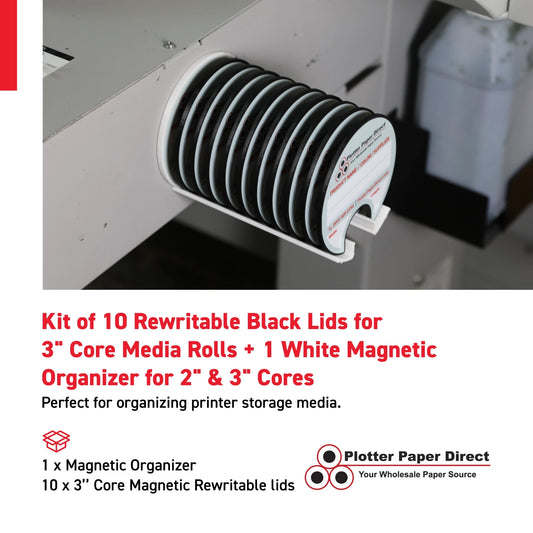Kit of 10 Rewritable Black Lids for 3" Core Media Rolls + 1 White Magnetic Wall Organizer for 2" & 3" Cores – Durable Storage Solution for Print & Sign Shops
