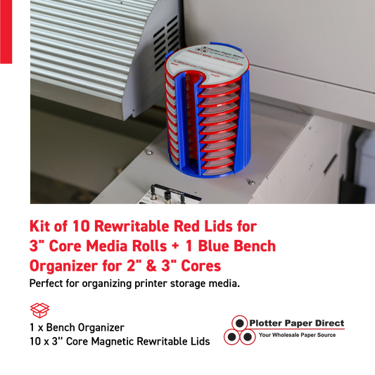 Kit of 10 Rewritable Red Lids for 3" Core Media Rolls + 1 Blue Bench Organizer for 2" & 3" Cores – Durable Storage & Organization for Print Shops and Studios