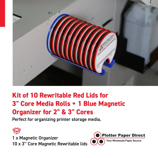 Kit of 10 Rewritable Red Lids for 3" Core Media Rolls + 1 Blue Magnetic Wall Organizer for 2" & 3" Cores – Durable Storage Solution for Print & Sign Shops