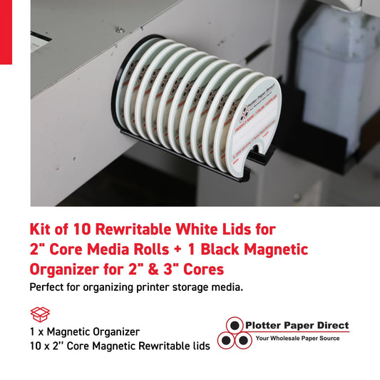 Kit of 10 Rewritable White Lids for 2" Core Media Rolls + 1 Black Magnetic Wall Organizer for 2" & 3" Cores – Durable Storage Solution for Print & Sign Shops