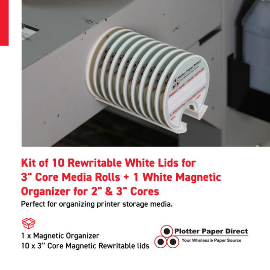 Kit of 10 Rewritable White Lids for 3" Core Media Rolls + 1 White Magnetic Wall Organizer for 2" & 3" Cores – Durable Storage Solution for Print & Sign Shops