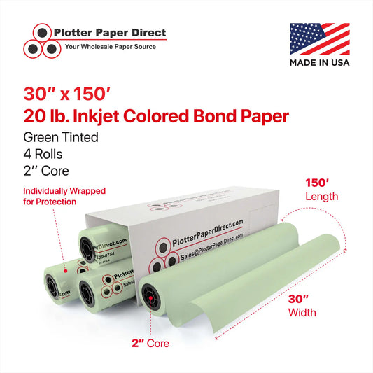 30'' x 150' Rolls - 20 lb Green Tinted/Colored Bond Plotter Paper on 2'' Core (Pack of 4)