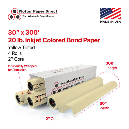 30'' x 300' Rolls - 20 lb Yellow Tinted/Colored Bond Plotter Paper on 2'' Core (Pack of 4)
