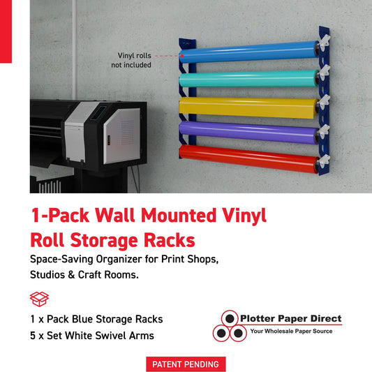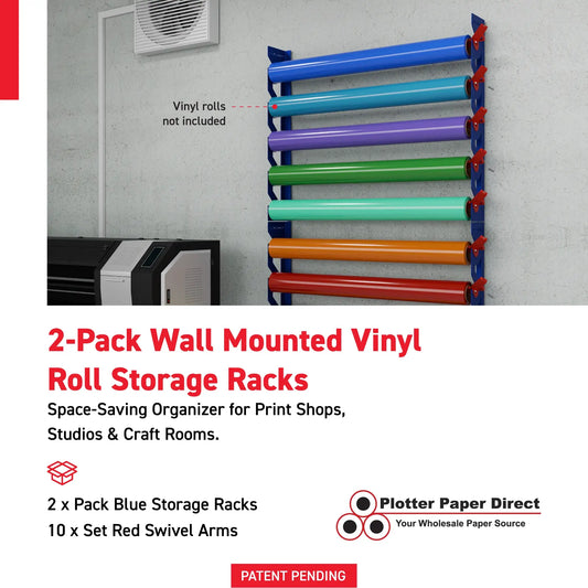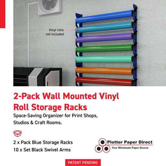 2-Pack Wall Mounted Vinyl Roll Storage Racks – Blue Aluminum with White ABS Swivel Arms, Holds 10 Rolls Total, Space-Saving Organizer for Print Shops, Studios & Craft Rooms