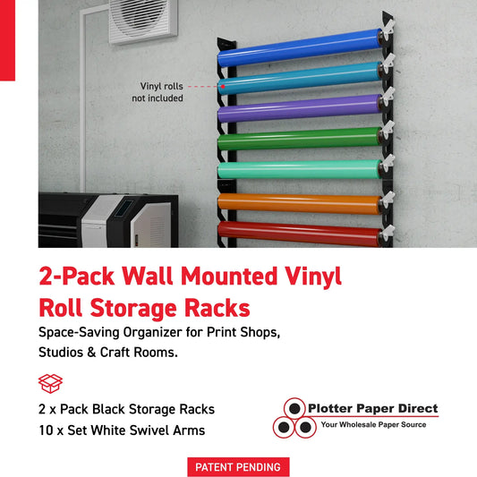 2-Pack Wall Mounted Vinyl Roll Storage Racks – Black Aluminum with Black ABS Swivel Arms, Holds 10 Rolls Total, Space-Saving Organizer for Print Shops, Studios & Craft Rooms