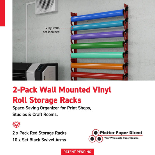 2-Pack Wall Mounted Vinyl Roll Storage Racks – Red Aluminum with Red ABS Swivel Arms, Holds 10 Rolls Total, Space-Saving Organizer for Print Shops, Studios & Craft Rooms