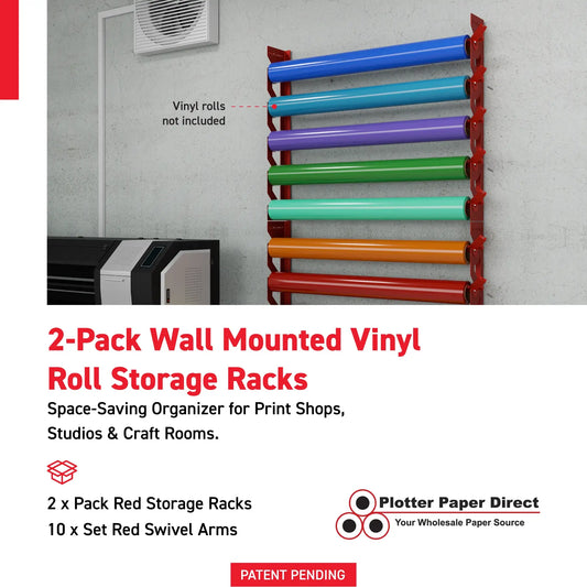 2-Pack Wall Mounted Vinyl Roll Storage Racks – Red Aluminum with White ABS Swivel Arms, Holds 10 Rolls Total, Space-Saving Organizer for Print Shops, Studios & Craft Rooms