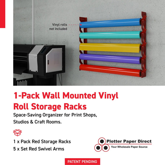 Red Aluminum Wall Mounted Vinyl Roll Storage Rack with Red V-Bracket ABS Plastic Swivel Arm – Holds 5 Vinyl Rolls, Space-Saving Organizer for Studios & Print Shops