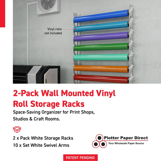 2-Pack Wall Mounted Vinyl Roll Storage Racks – White Aluminum with White ABS Swivel Arms, Holds 10 Rolls Total, Space-Saving Organizer for Print Shops, Studios & Craft Rooms