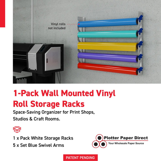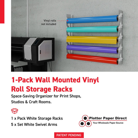 White Aluminum Wall Mounted Vinyl Roll Storage Rack with White V-Bracket ABS Plastic Swivel Arm – Holds 5 Vinyl Rolls, Space-Saving Organizer for Studios & Print Shops