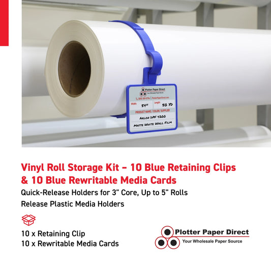Vinyl Roll Storage Kit – 10 Blue Retaining Clips & 10 Blue Writable MediaCards | Quick-Release Holders for 3" Core, Up to 5" Rolls | Double-Sided Labeling for Size, Color & Supplier