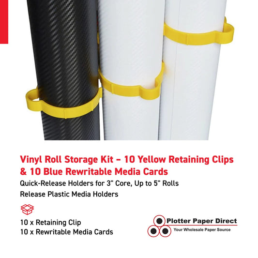 Vinyl Roll Storage Kit – 10 Yellow Retaining Clips & 10 Blue Writable MediaCards | Quick-Release Holders for 3" Core, Up to 5" Rolls | Double-Sided Labeling for Size, Color & Supplier