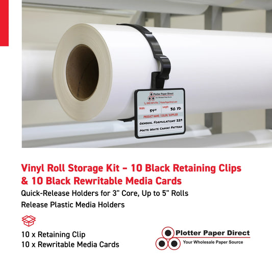 Vinyl Roll Storage Kit – 10 Black Retaining Clips & 10 Black Writable MediaCards | Quick-Release Holders for 3" Core, Up to 5" Rolls | Double-Sided Labeling for Size, Color & Supplier