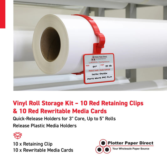 Vinyl Roll Storage Kit – 10 Red Retaining Clips & 10 Red Writable MediaCards | Quick-Release Holders for 3" Core, Up to 5" Rolls | Double-Sided Labeling for Size, Color & Supplier