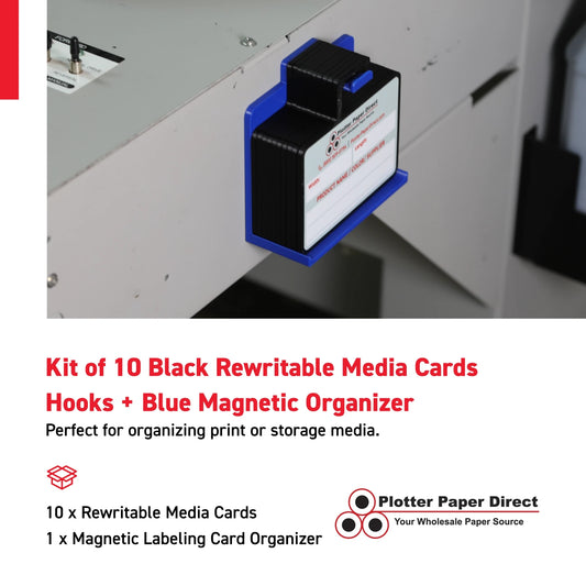 Kit of 10 Black Rewritable MediaCards Hooks + Blue Magnetic Wall Organizer – Dry-Erase Labeling Kit for Vinyl Roll Storage in Print & Sign Shops