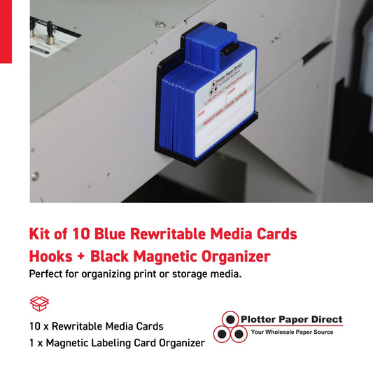 Kit of 10 Blue Rewritable MediaCards Hooks + Black Magnetic Wall Organizer – Dry-Erase Labeling Kit for Vinyl Roll Storage in Print & Sign Shops