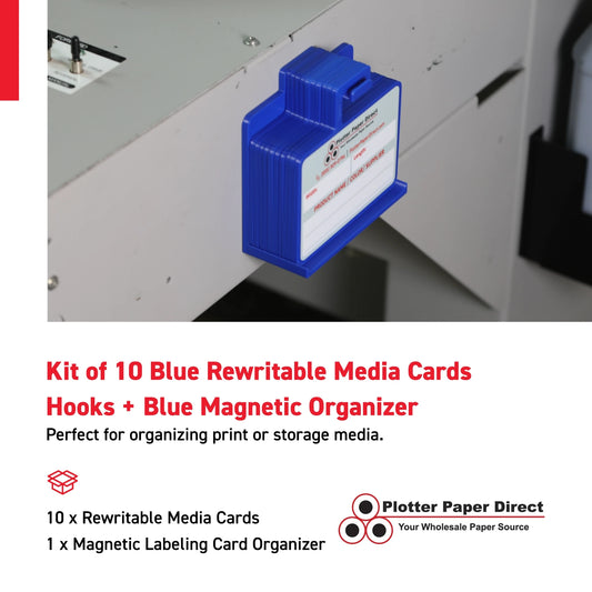 Kit of 10 Blue Rewritable MediaCards Hooks + Blue Magnetic Wall Organizer – Dry-Erase Labeling Kit for Vinyl Roll Storage in Print & Sign Shops