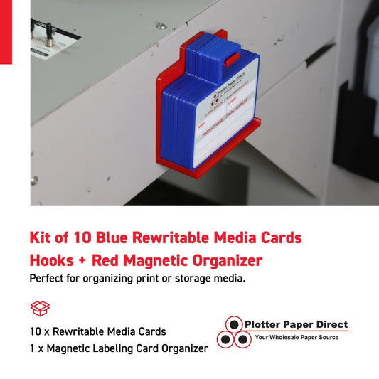 Kit of 10 Blue Rewritable MediaCards Hooks + Red Magnetic Wall Organizer – Dry-Erase Labeling Kit for Vinyl Roll Storage in Print & Sign Shops