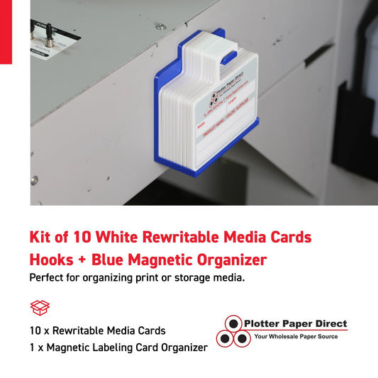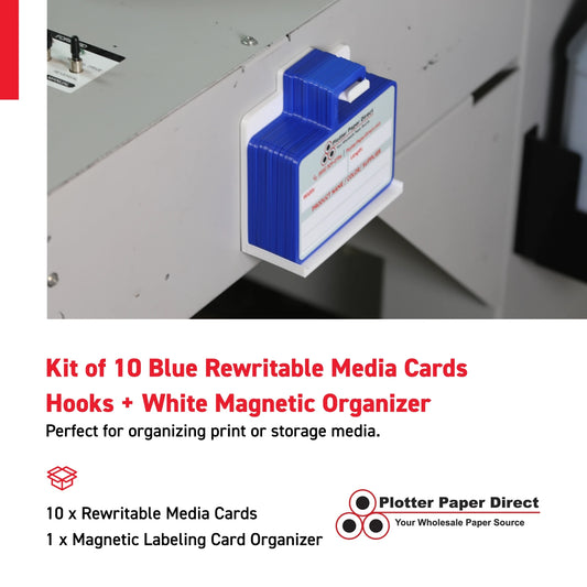 Kit of 10 White Rewritable MediaCards Hooks + Blue Magnetic Wall Organizer – Dry-Erase Labeling Kit for Vinyl Roll Storage in Print & Sign Shops