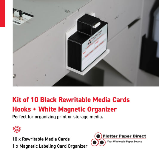 Kit of 10 Black Rewritable MediaCards Hooks + White Magnetic Wall Organizer – Dry-Erase Labeling Kit for Vinyl Roll Storage in Print & Sign Shops