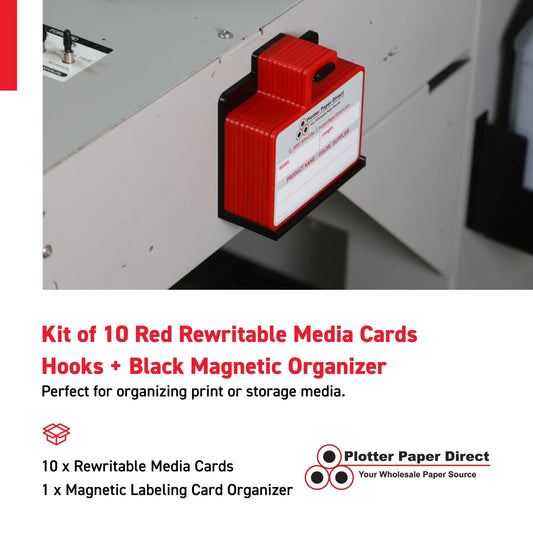 Kit of 10 Red Rewritable MediaCards Hooks + Black Magnetic Wall Organizer – Dry-Erase Labeling Kit for Vinyl Roll Storage in Print & Sign Shops