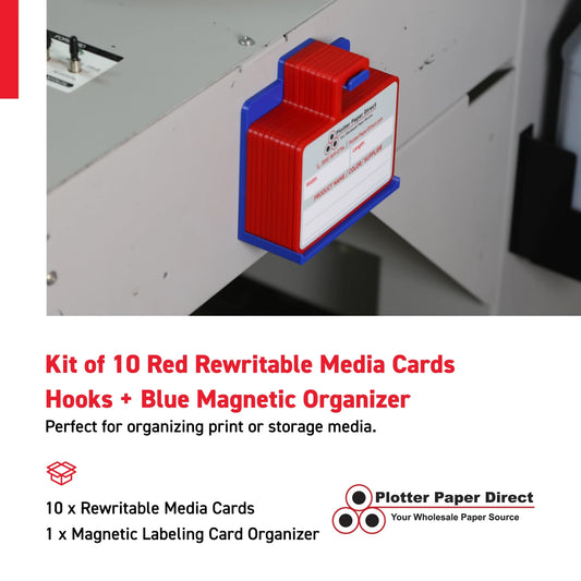 Kit of 10 Red Rewritable MediaCards Hooks + Blue Magnetic Wall Organizer – Dry-Erase Labeling Kit for Vinyl Roll Storage in Print & Sign Shops