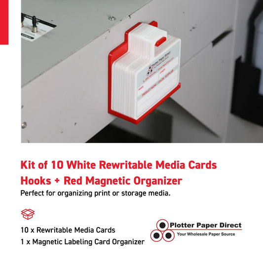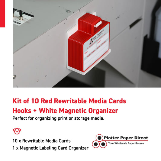 Kit of 10 White Rewritable MediaCards Hooks + Red Magnetic Wall Organizer – Dry-Erase Labeling Kit for Vinyl Roll Storage in Print & Sign Shops