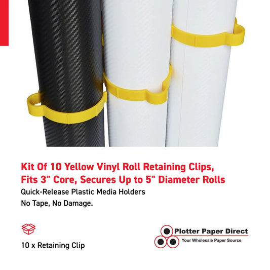 Kit Of 10 Yellow Vinyl Roll Retaining Clips, Quick-Release Plastic Media Holders, No Tape, No Damage, Fits 3" Core, Secures Up to 5" Diameter Rolls