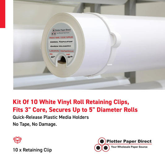 Kit Of 10 White Vinyl Roll Retaining Clips, Quick-Release Plastic Media Holders, No Tape, No Damage, Fits 3" Core, Secures Up to 5" Diameter Rolls