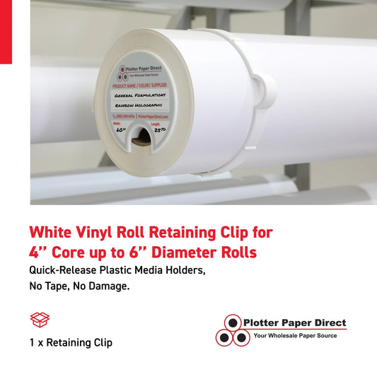 White Vinyl Roll Retaining Clips, Quick-Release Plastic Media Holders, No Tape, No Damage, Fits 4" Core, Secures Up to 6" Diameter Rolls