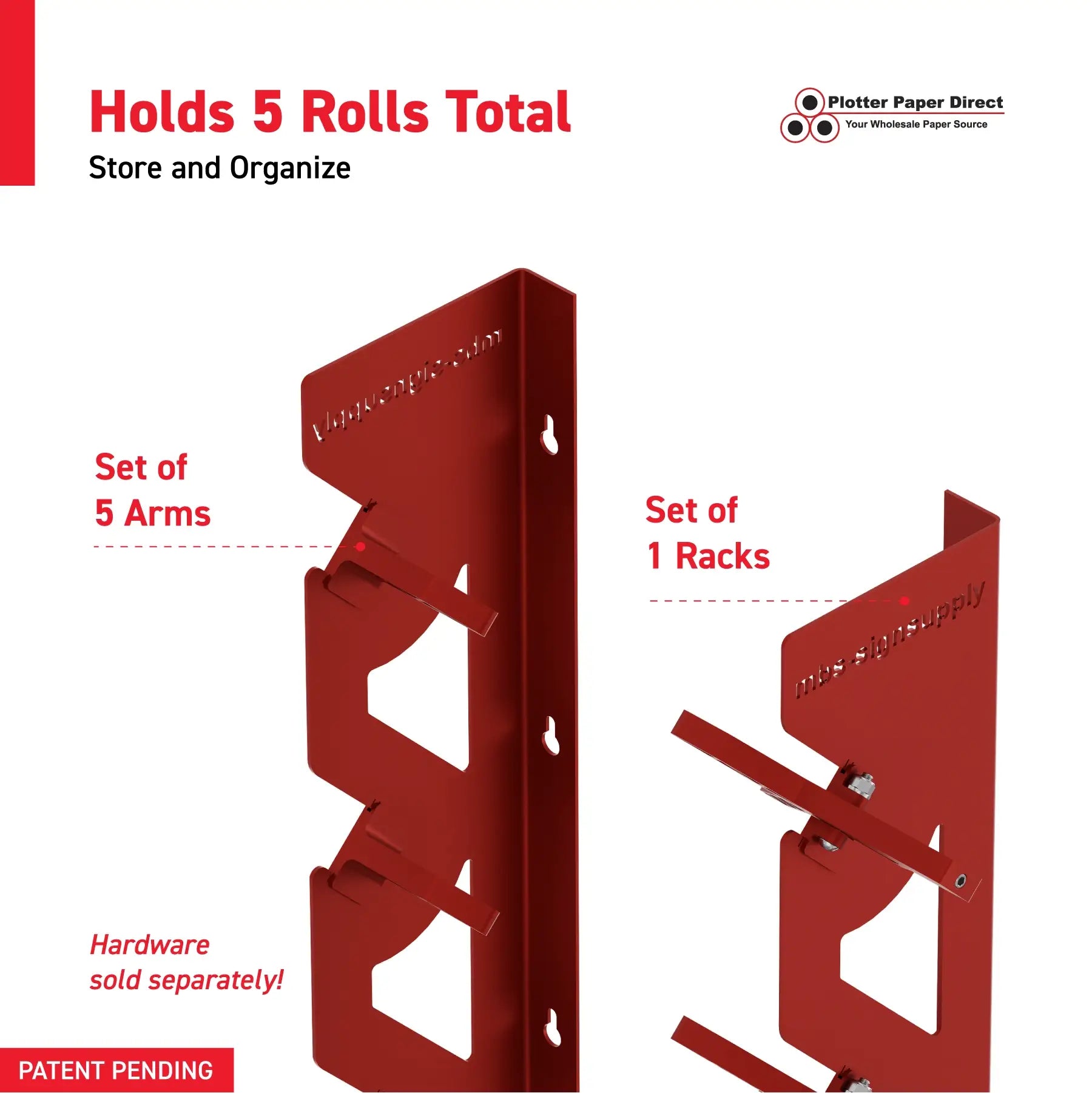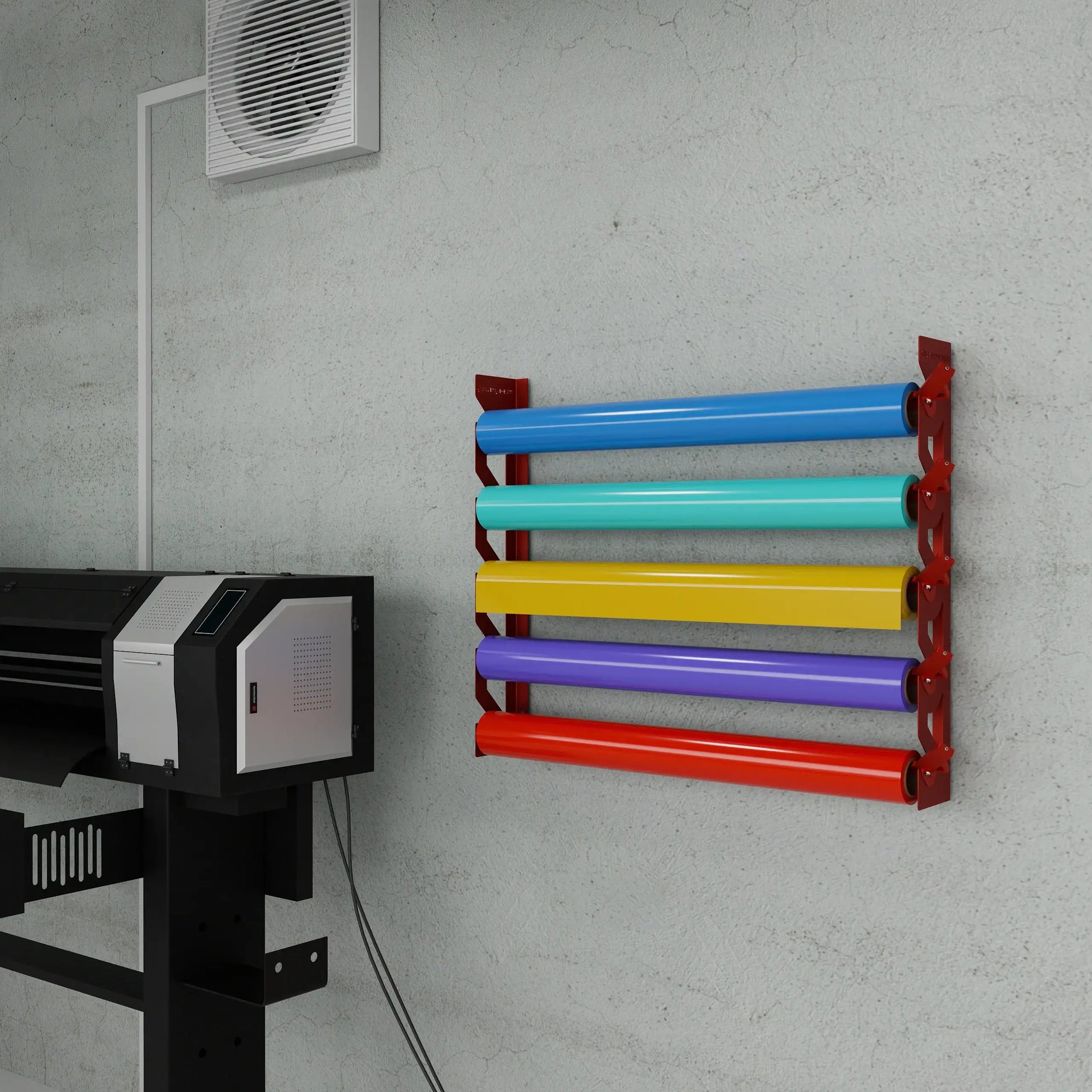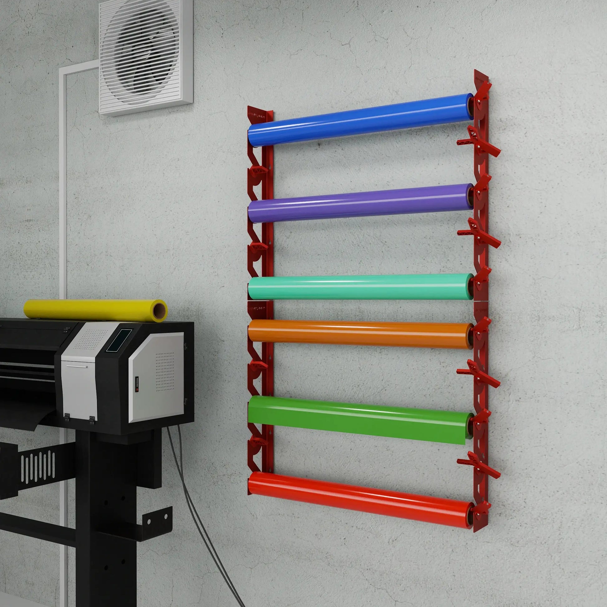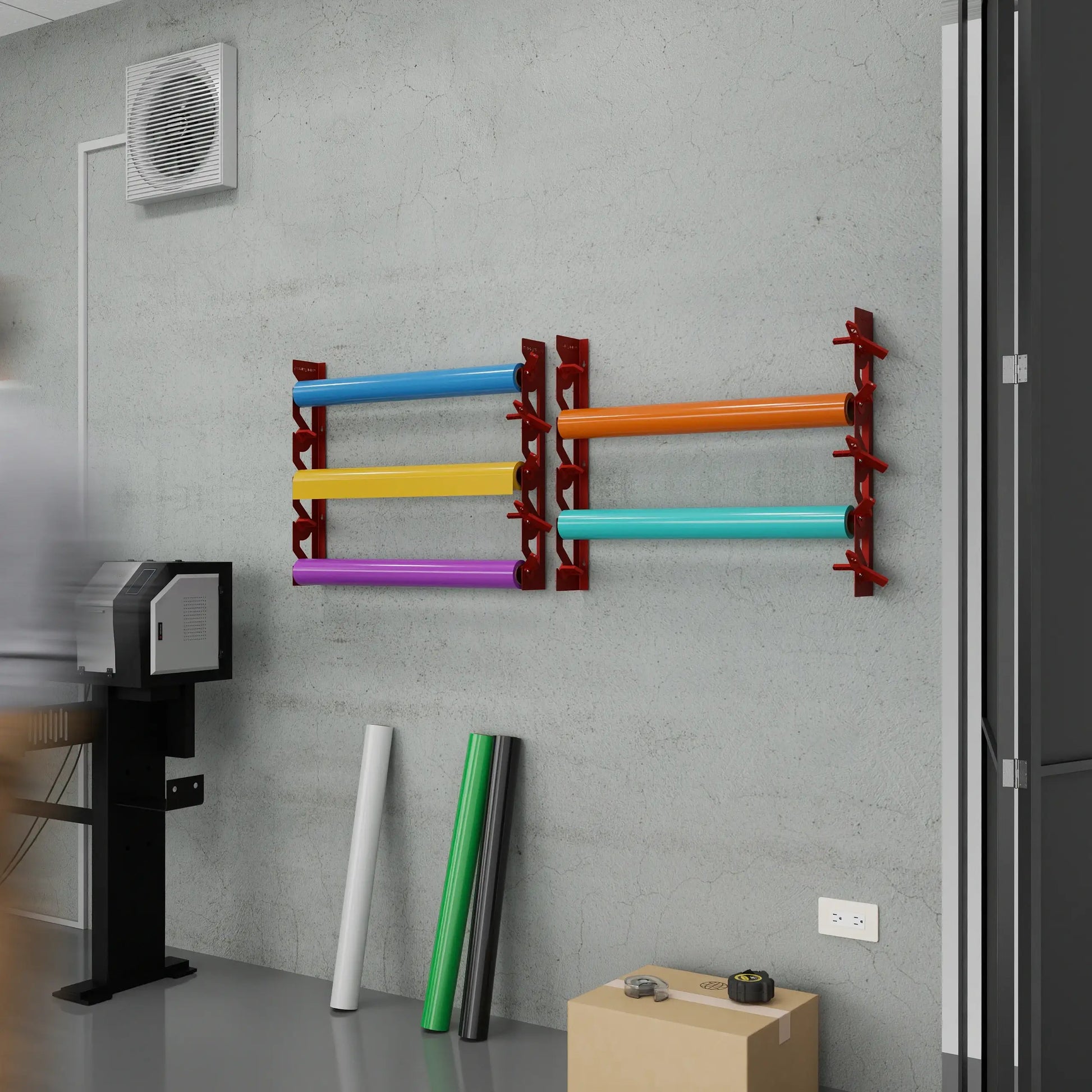 Red wall-mounted storage system with Red ABS swivel arm. Holds 5 vinyl or media rolls. Durable, space-saving, and ideal for studios, print shops, or craft rooms.
