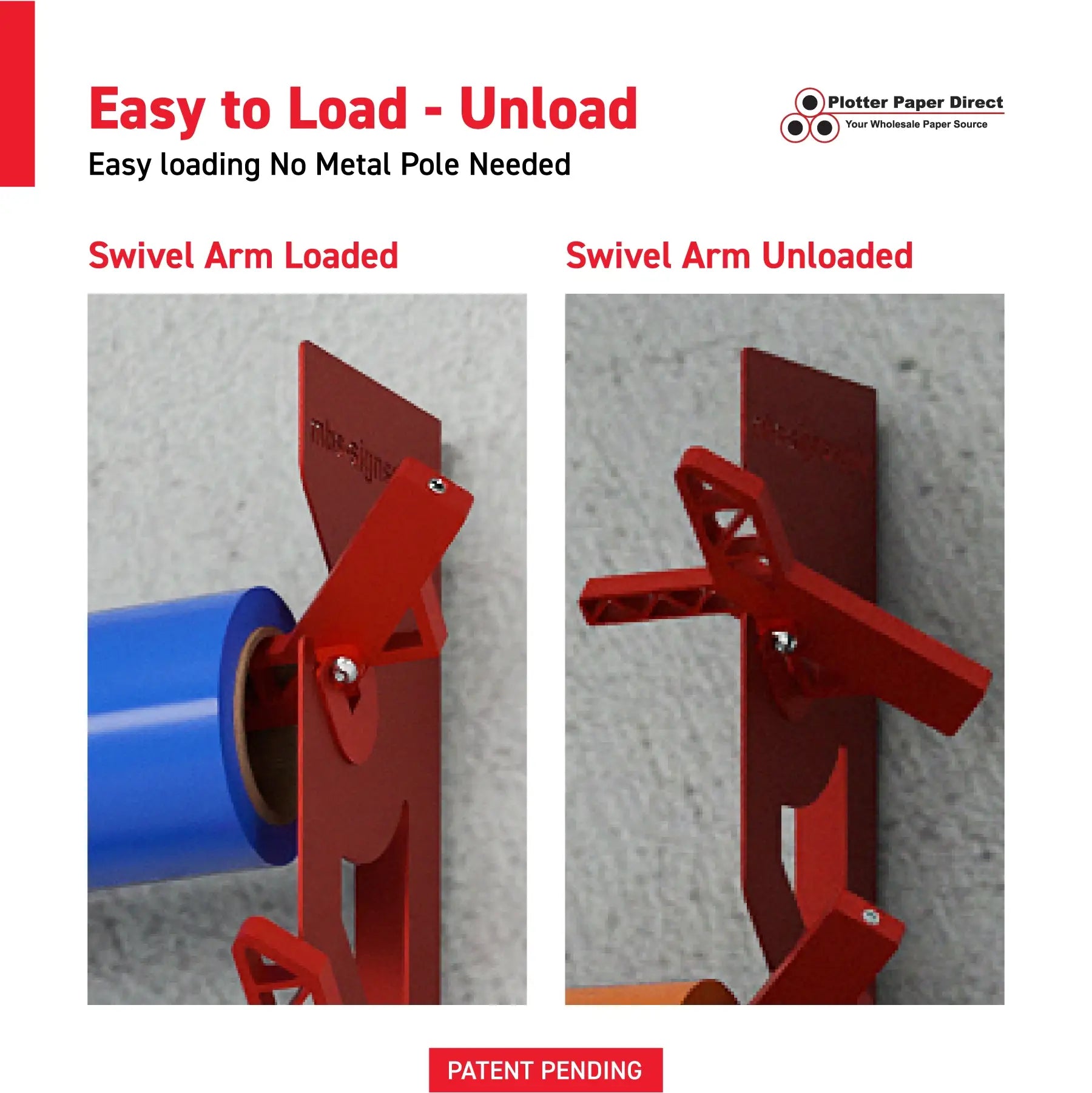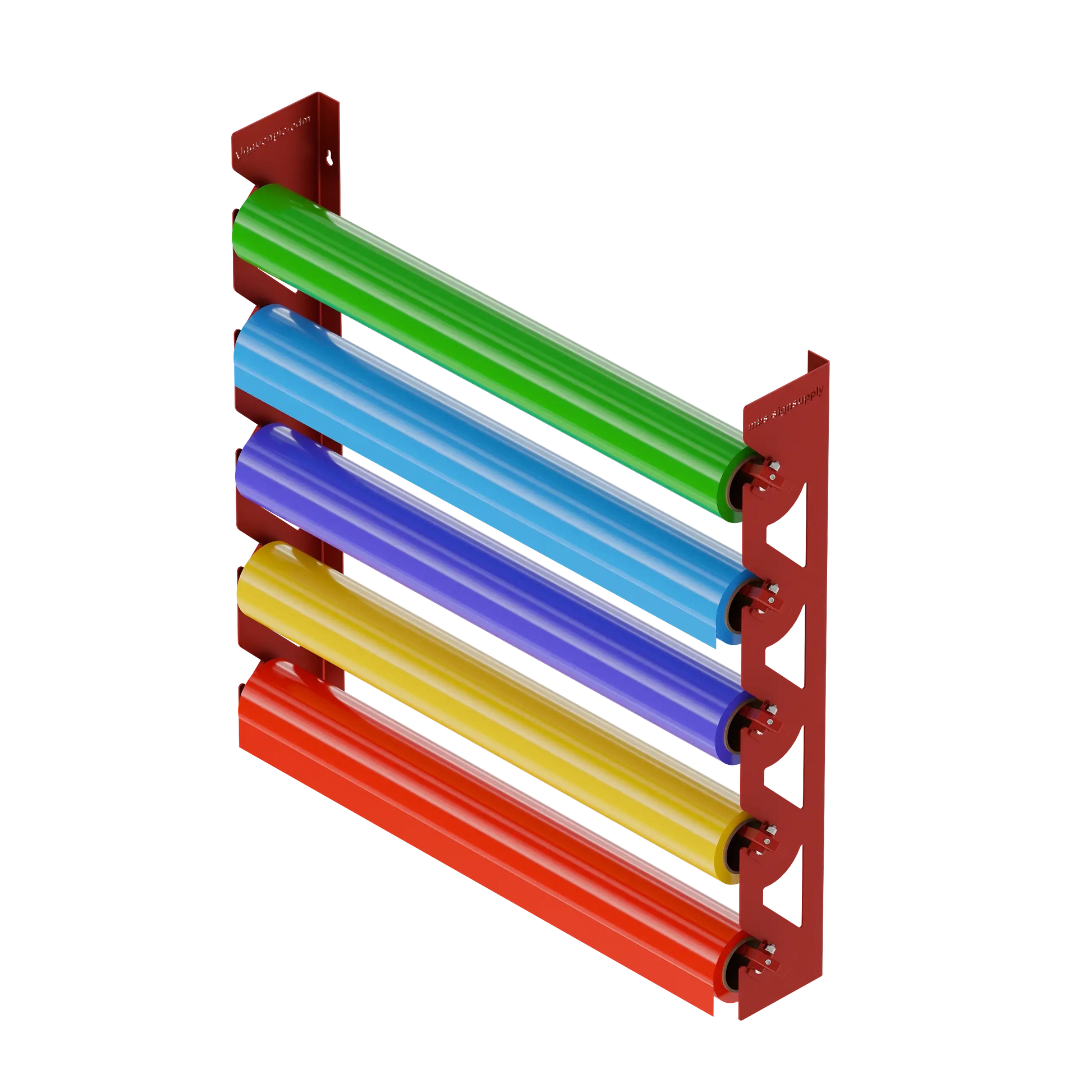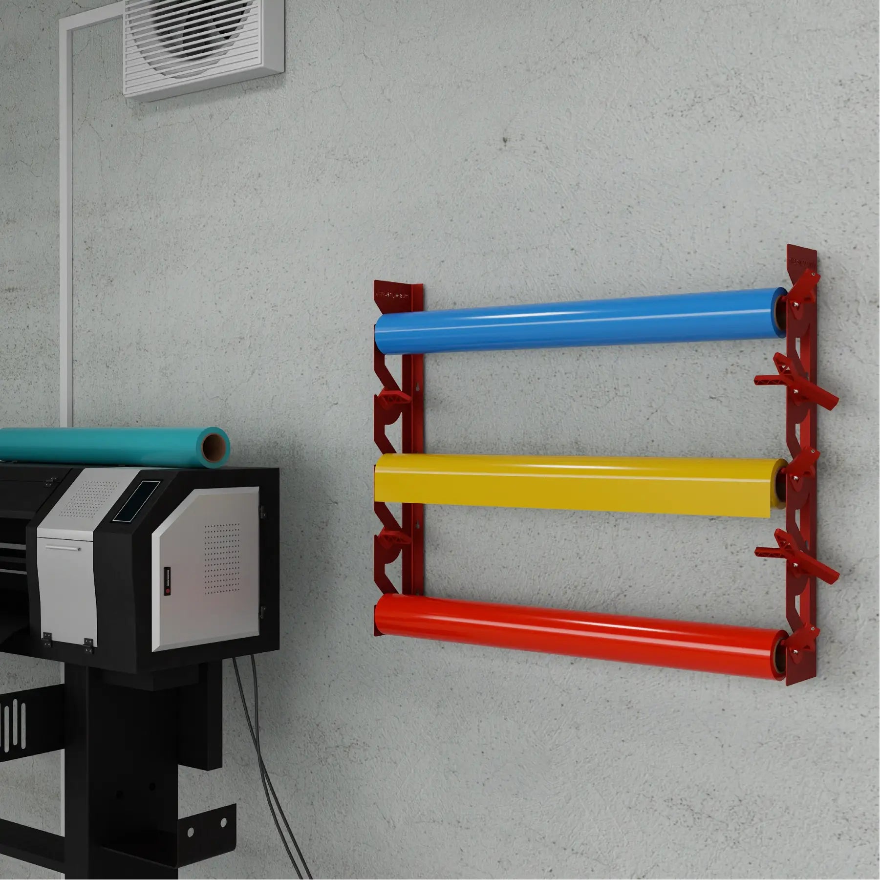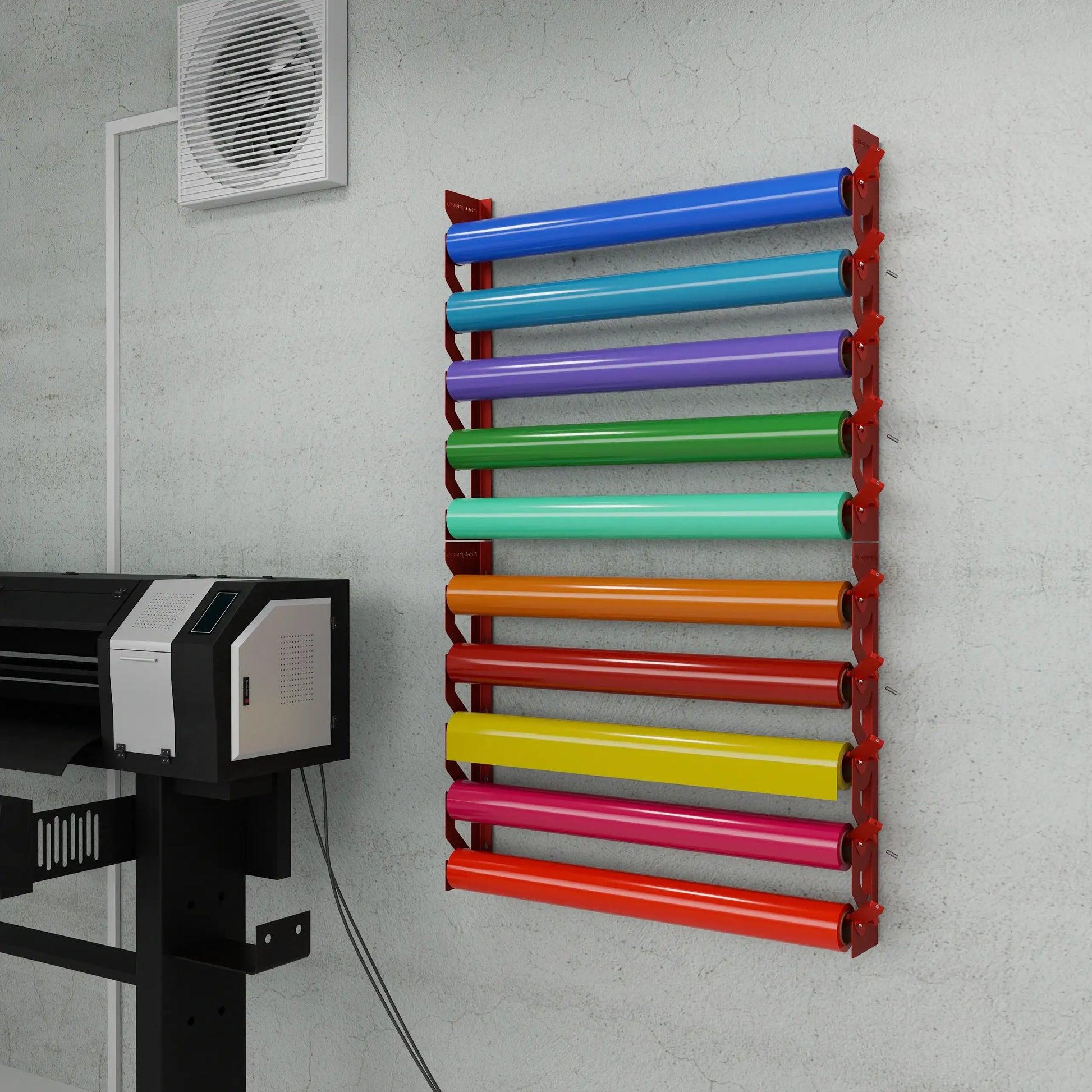 Red wall-mounted storage system with Red ABS swivel arm. Holds 5 vinyl or media rolls. Durable, space-saving, and ideal for studios, print shops, or craft rooms.