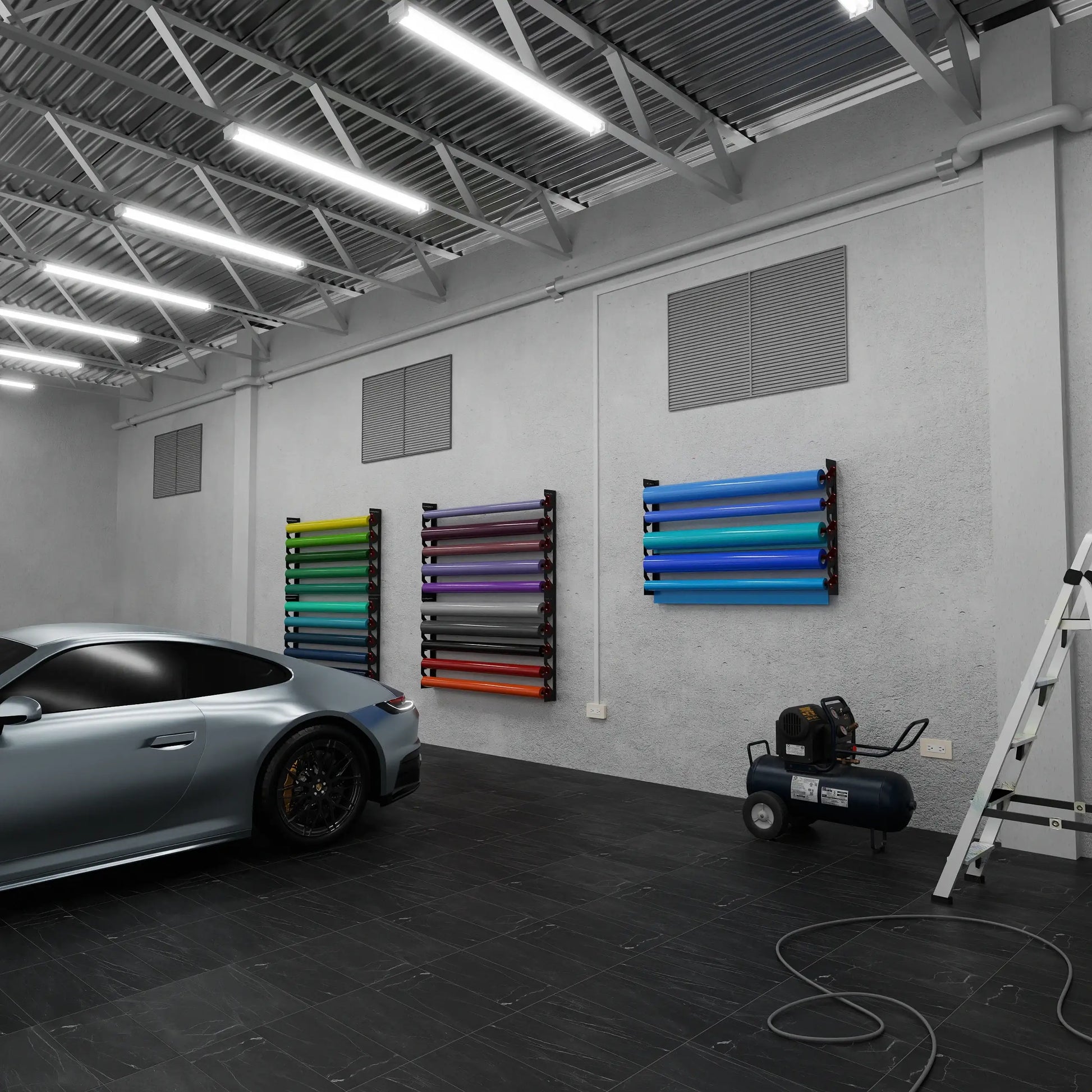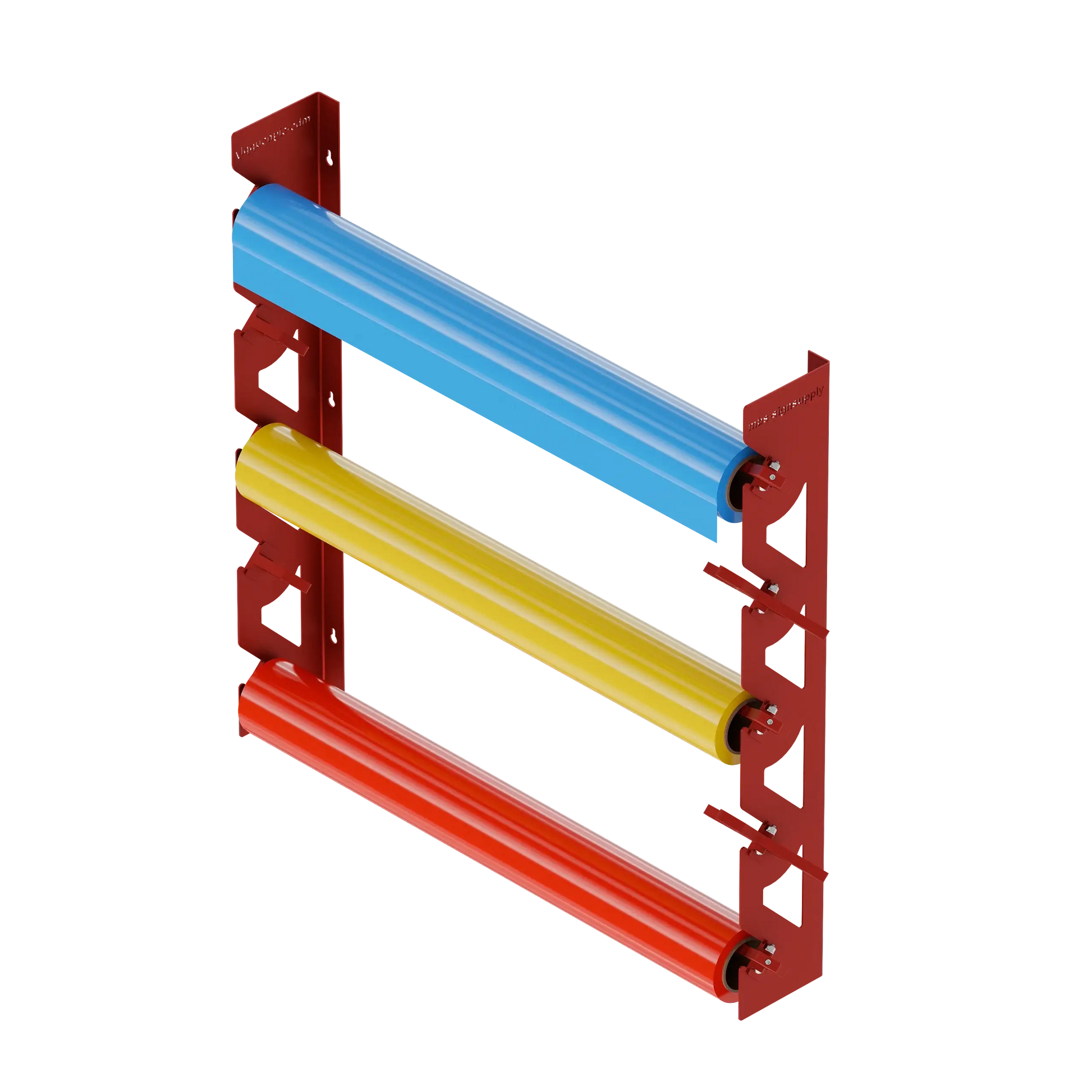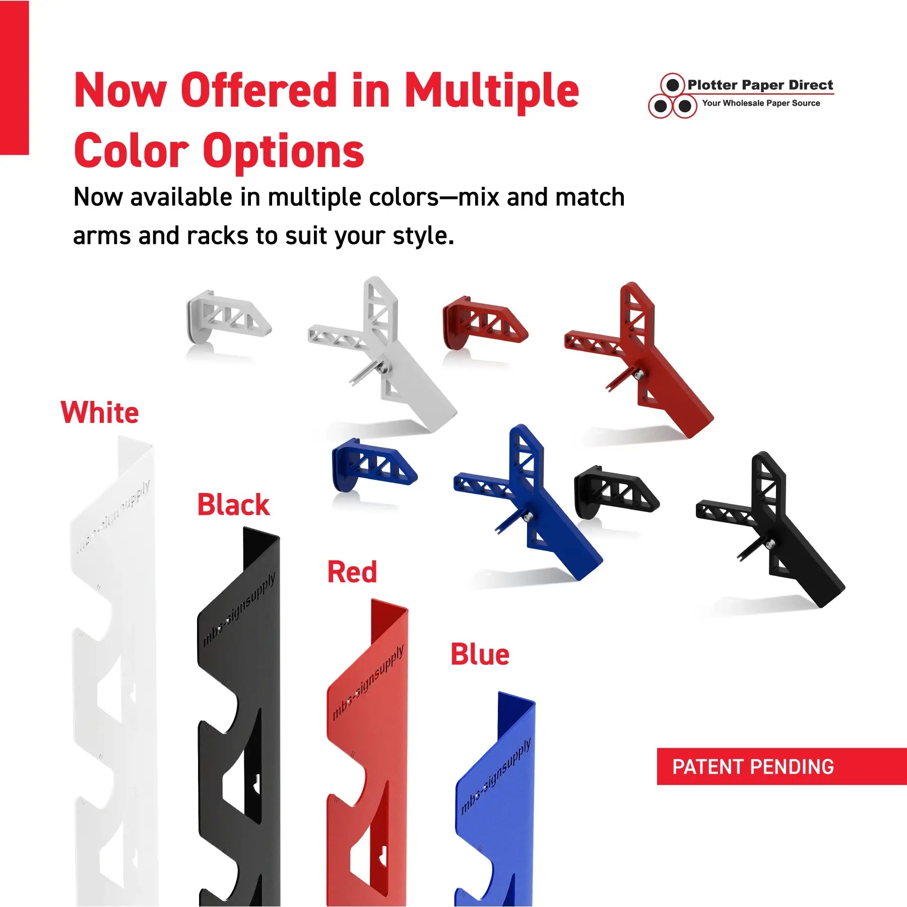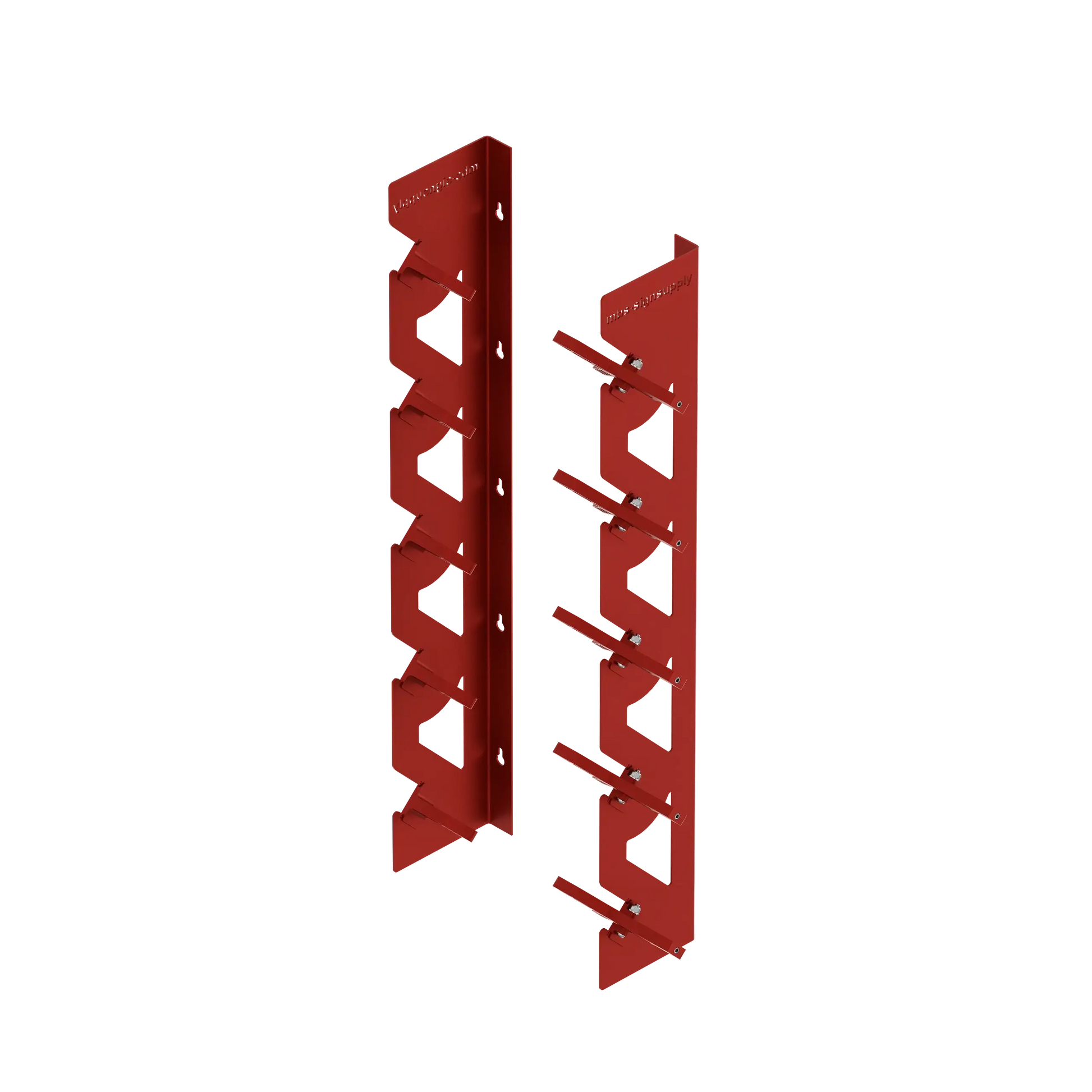 Red wall-mounted storage system with Red ABS swivel arm. Holds 5 vinyl or media rolls. Durable, space-saving, and ideal for studios, print shops, or craft rooms.