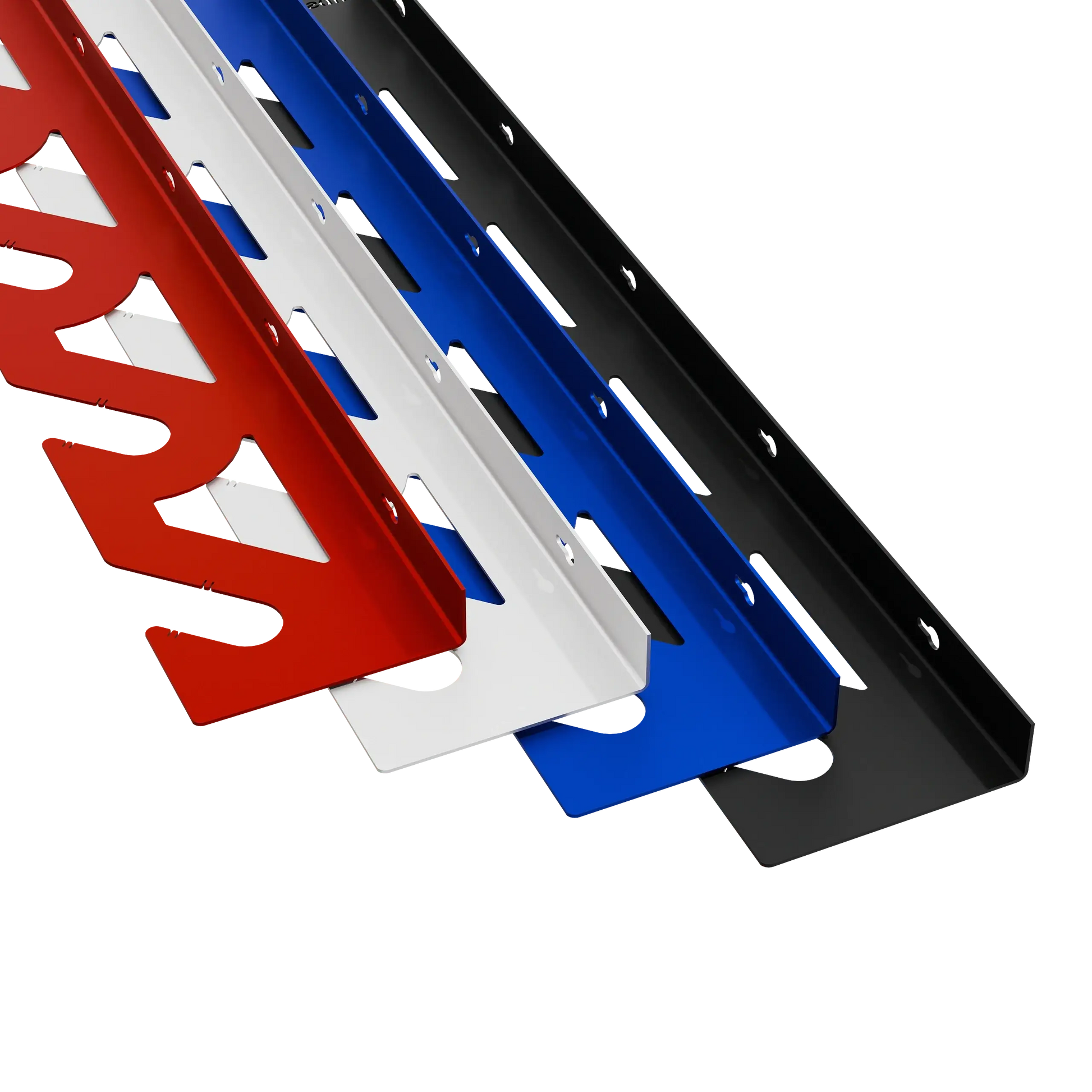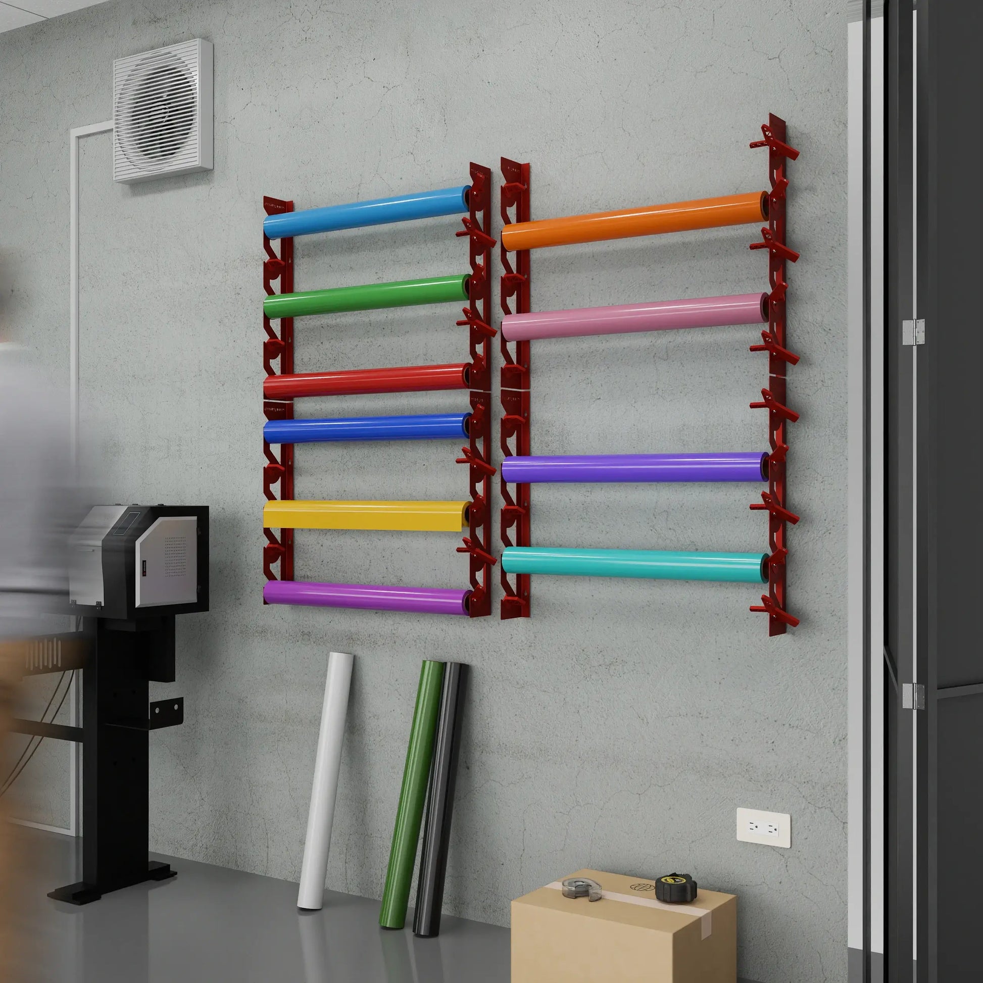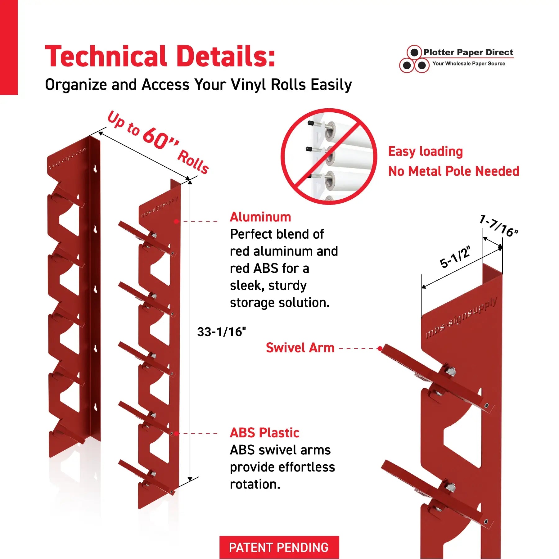 Red Aluminum Wall Mounted Vinyl Roll Storage Rack with Red V-Bracket ABS Plastic Swivel Arm – Holds 5 Vinyl Rolls, Space-Saving Organizer for Studios & Print Shops