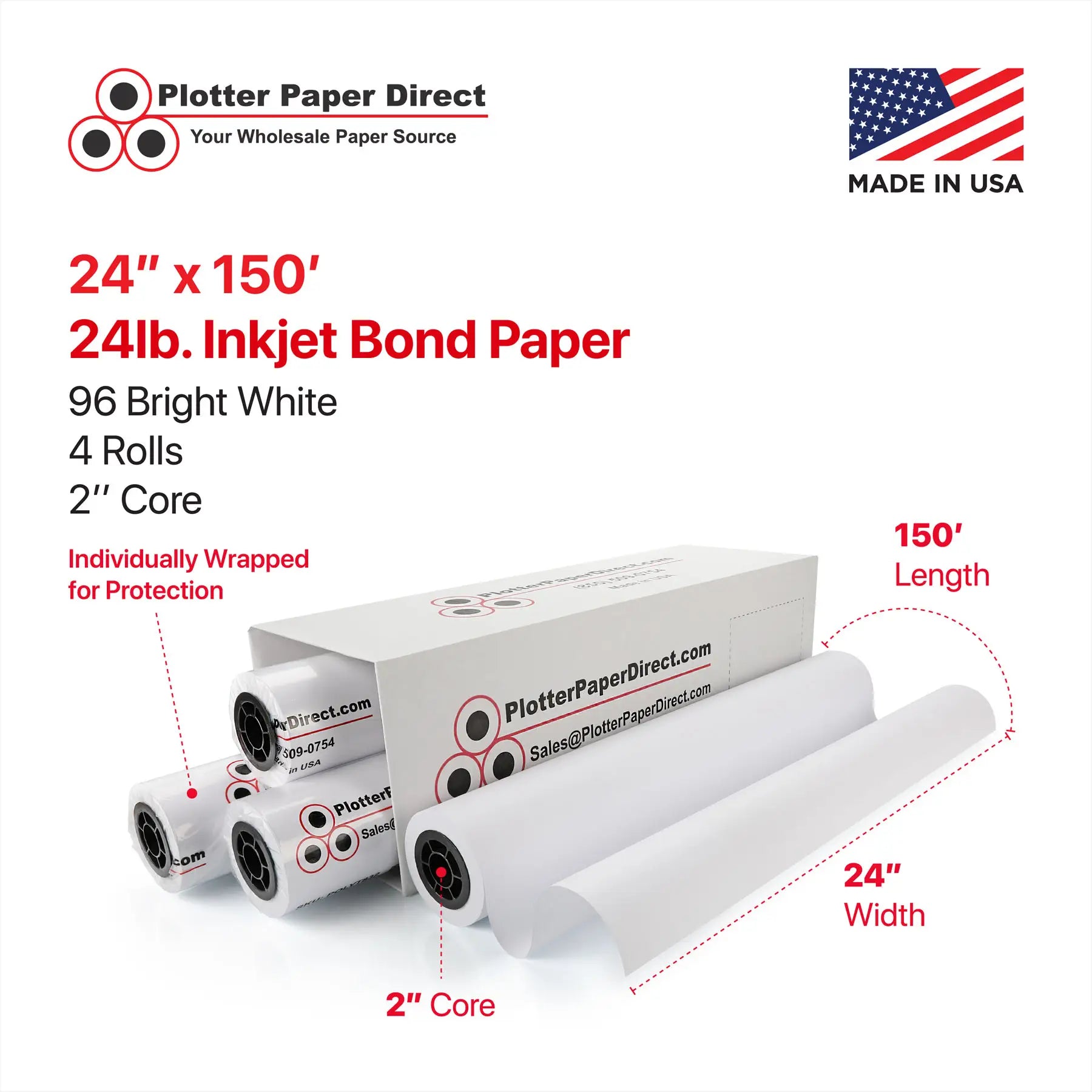 Plotter Paper Direct's economical 24# uncoated inkjet bond paper. High performance 24 lb. paper with a 92 bright white background on a 2" core. Comes 4 rolls to a box. Heavier weight than the 20 lb. paper for added durability. Ideal for CAD plotting in black and white. See our coated papers for best results with color/graphics printing.